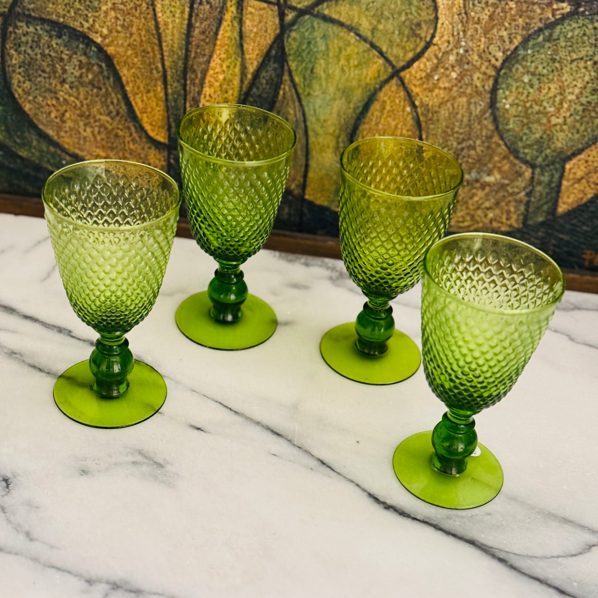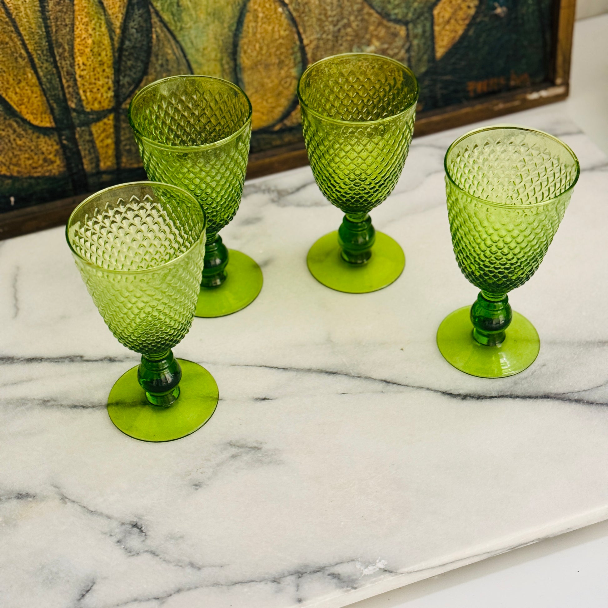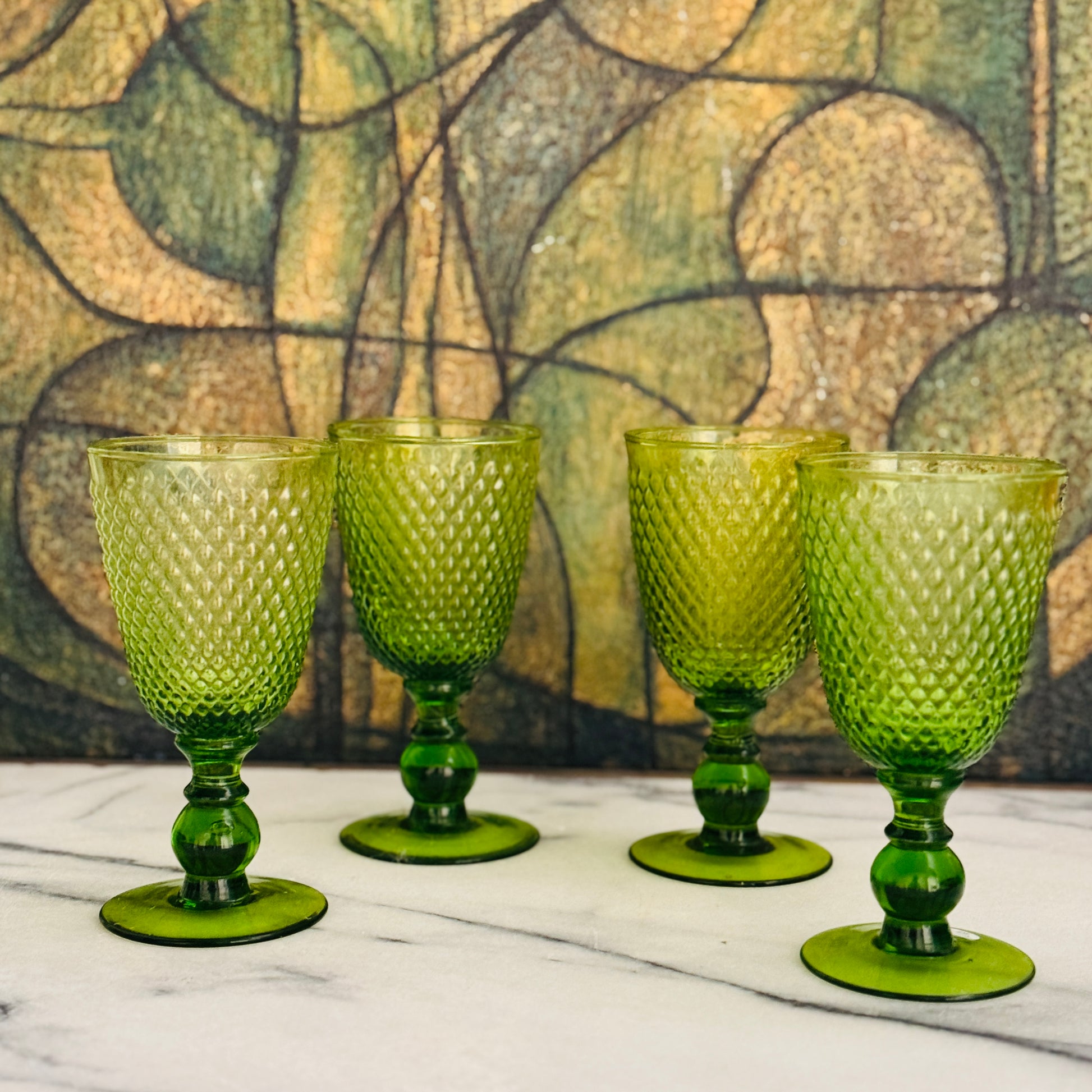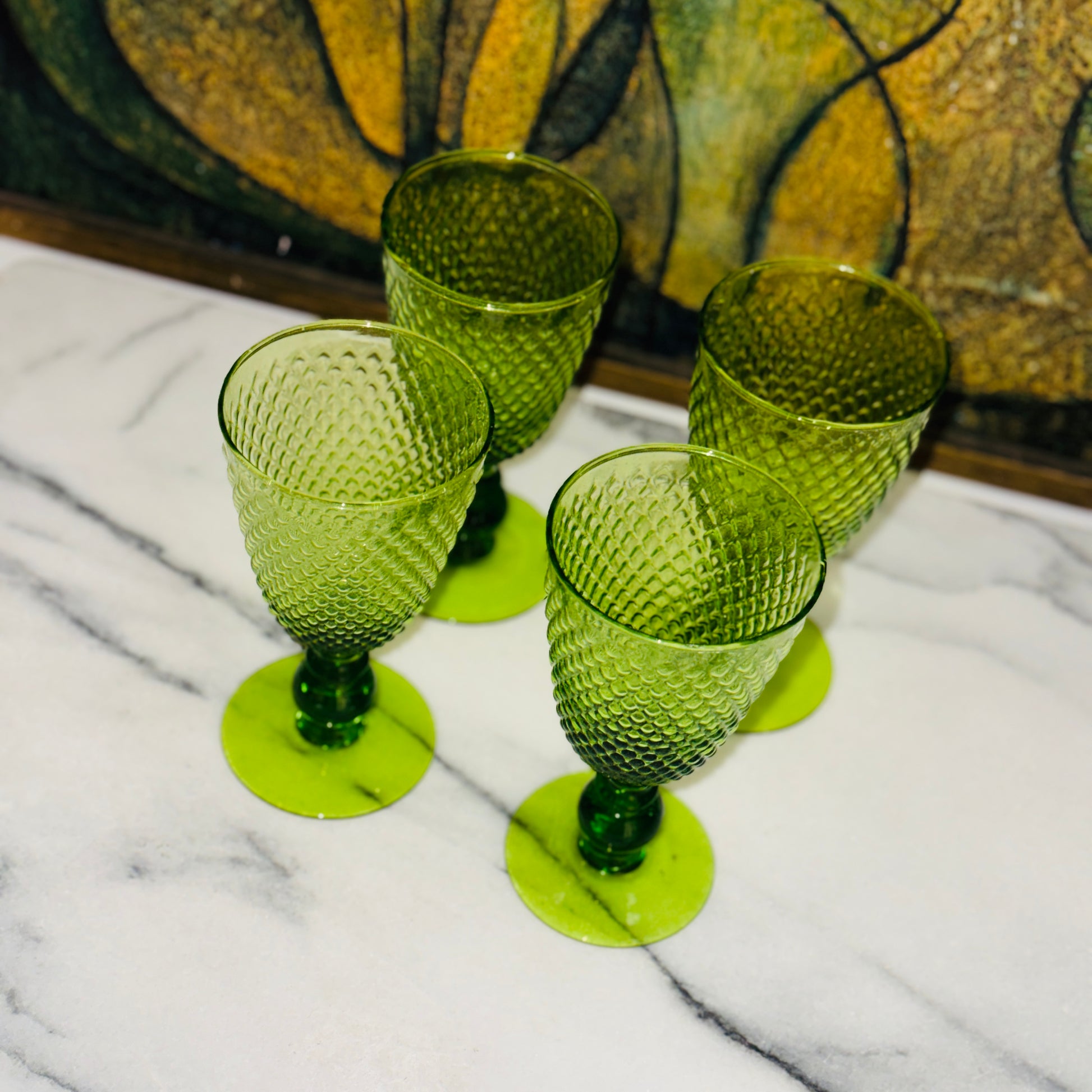 Set van 4 groene wijnglazen met reliëfglas. Één van de glazen heeft een mini chipke aan de voet
