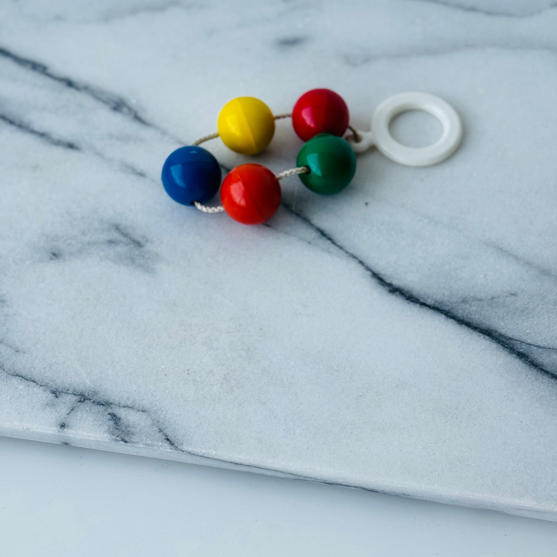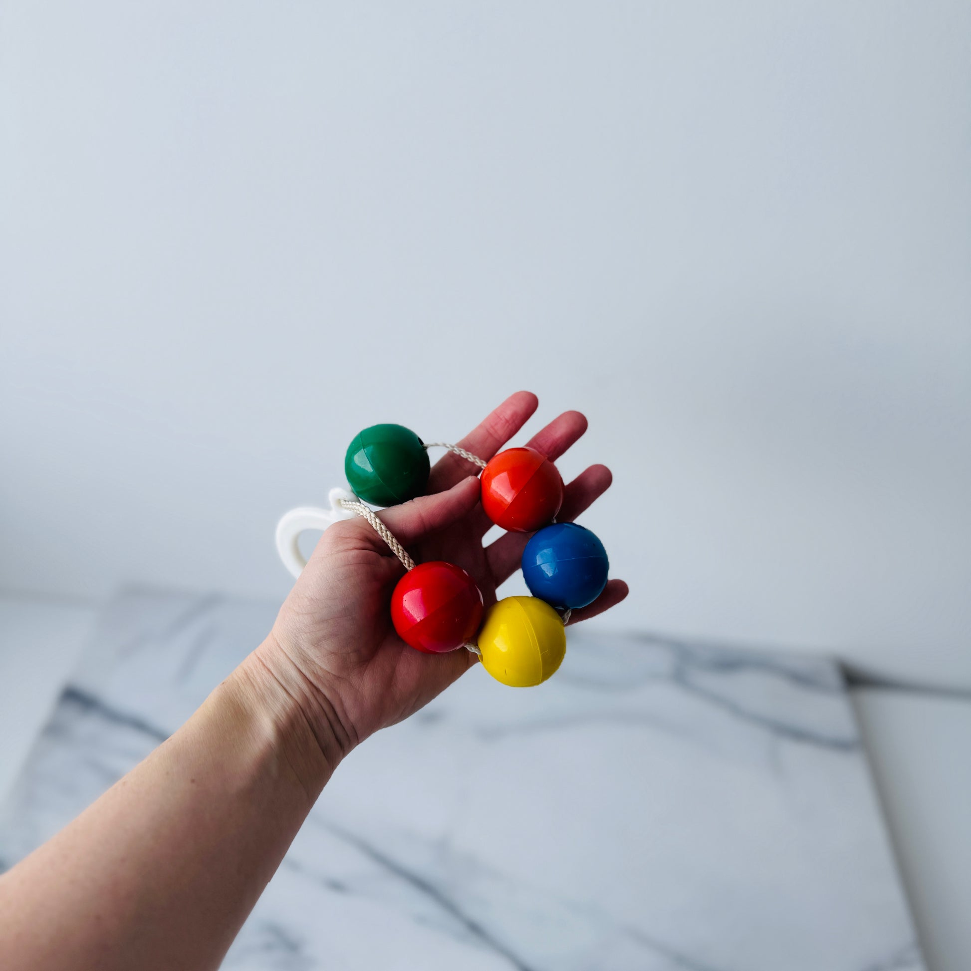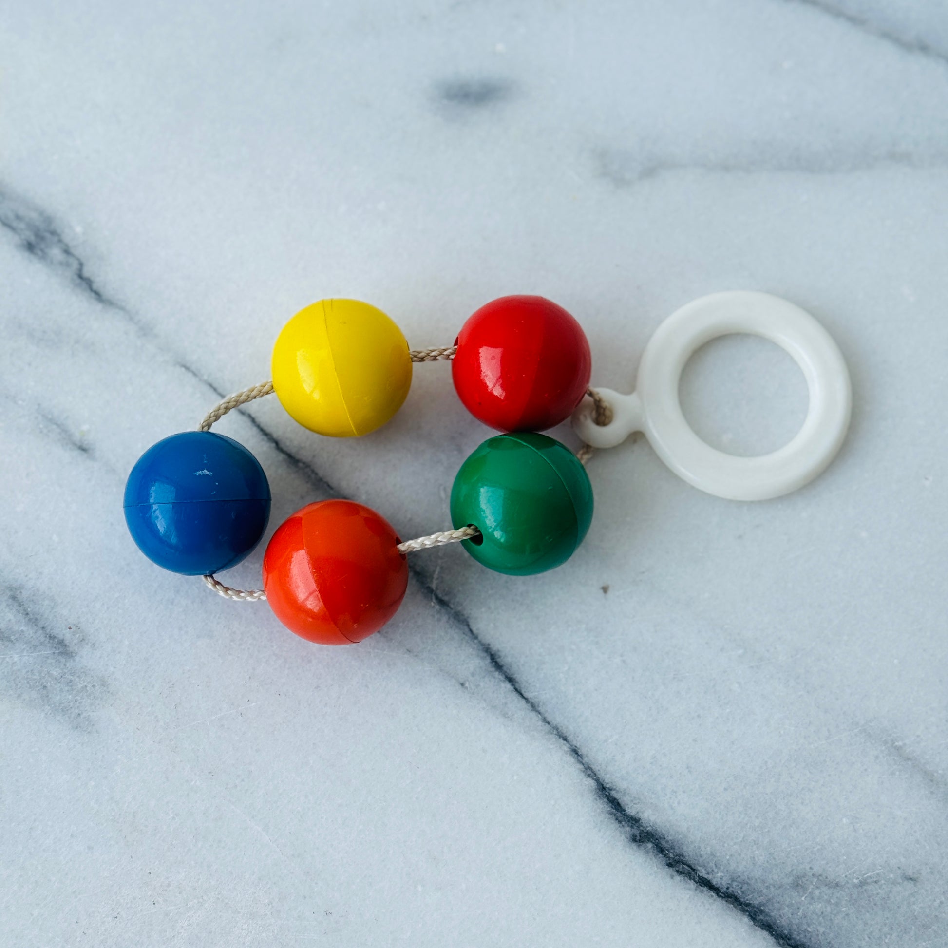 Geweldige rammelaar van het nostalgische merkje Ambi Toys. Voorzien van 5 gekleurde kunststof ballen aan een koord en afgewerkt met een handig handvatje.