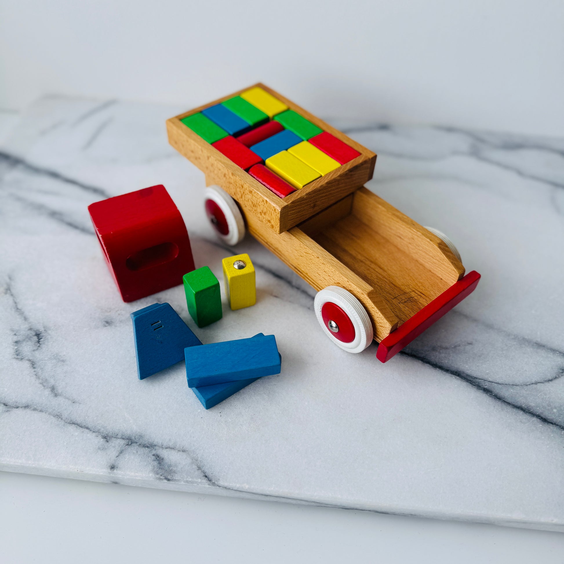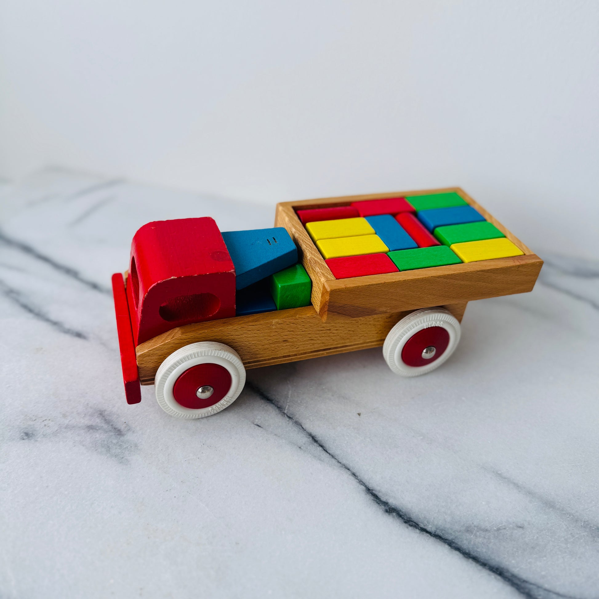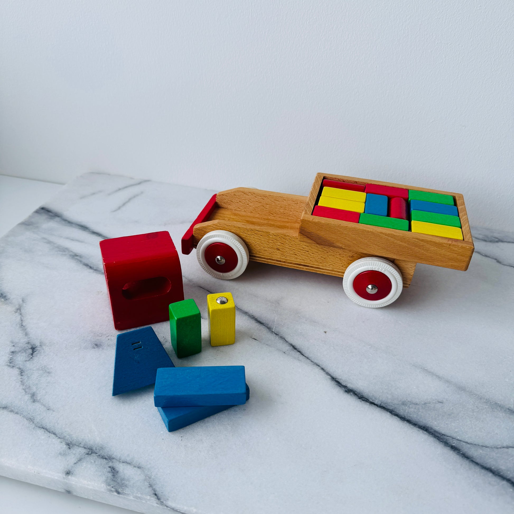 Woop woop! Uren spelplezier met deze houten vrachtwagen en blokkenkar. Enkele kleine streepjes balpen op de bodem van de voorste laadbak. Verder verkeert het speeltje in super staat!