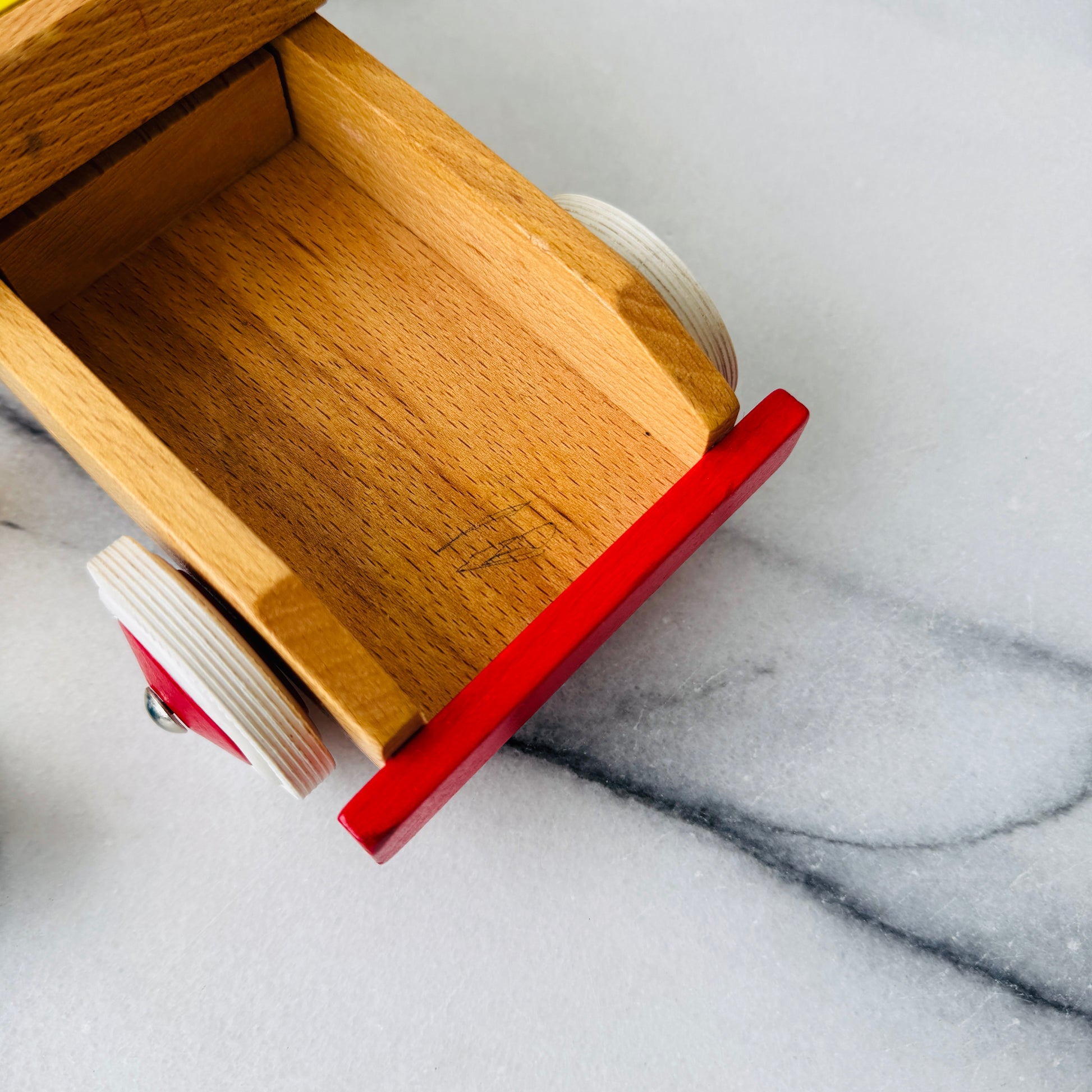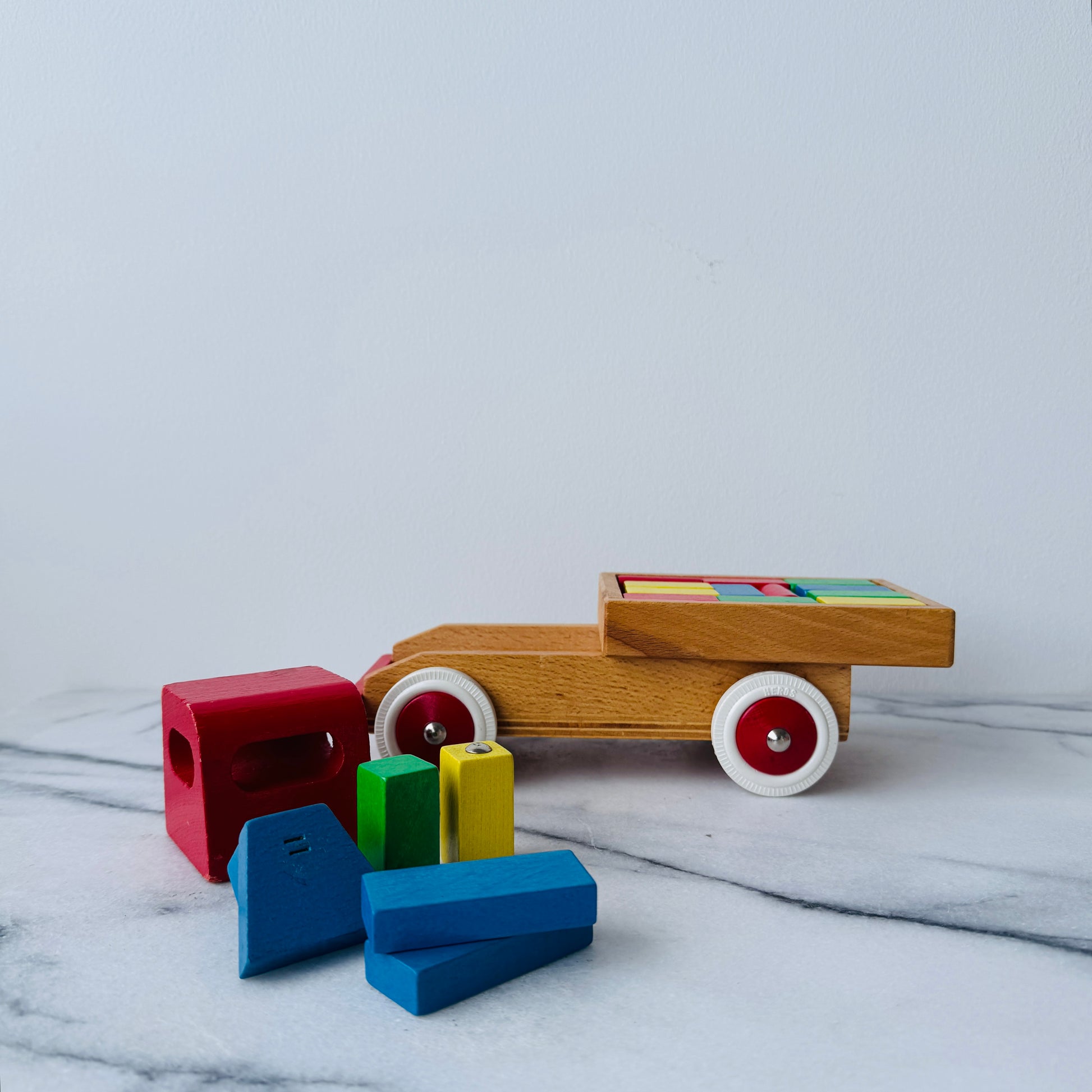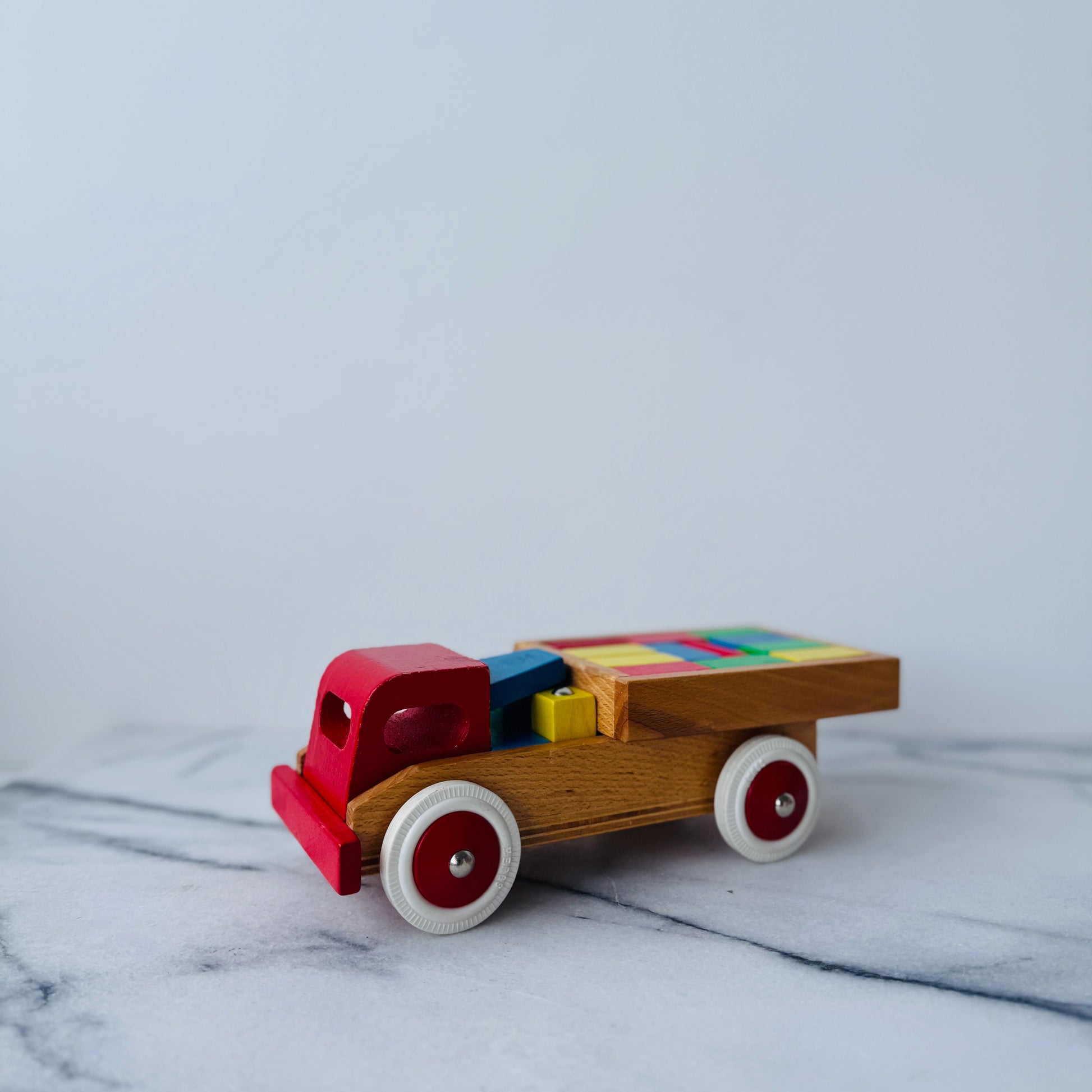 Woop woop! Uren spelplezier met deze houten vrachtwagen en blokkenkar. Enkele kleine streepjes balpen op de bodem van de voorste laadbak. Verder verkeert het speeltje in super staat!