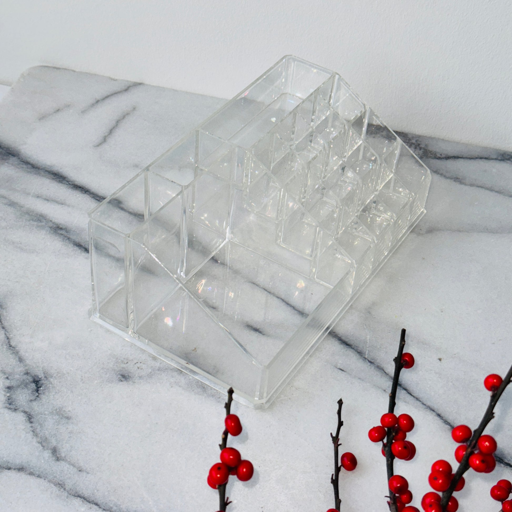 Een toffe bureau organiser in plexi glas. Handige combinatie van grote en kleine compartimenten voor balpennen, paperclips en sticky notes! Klein chipke van de onderkant maar is amper zichtbaar.
