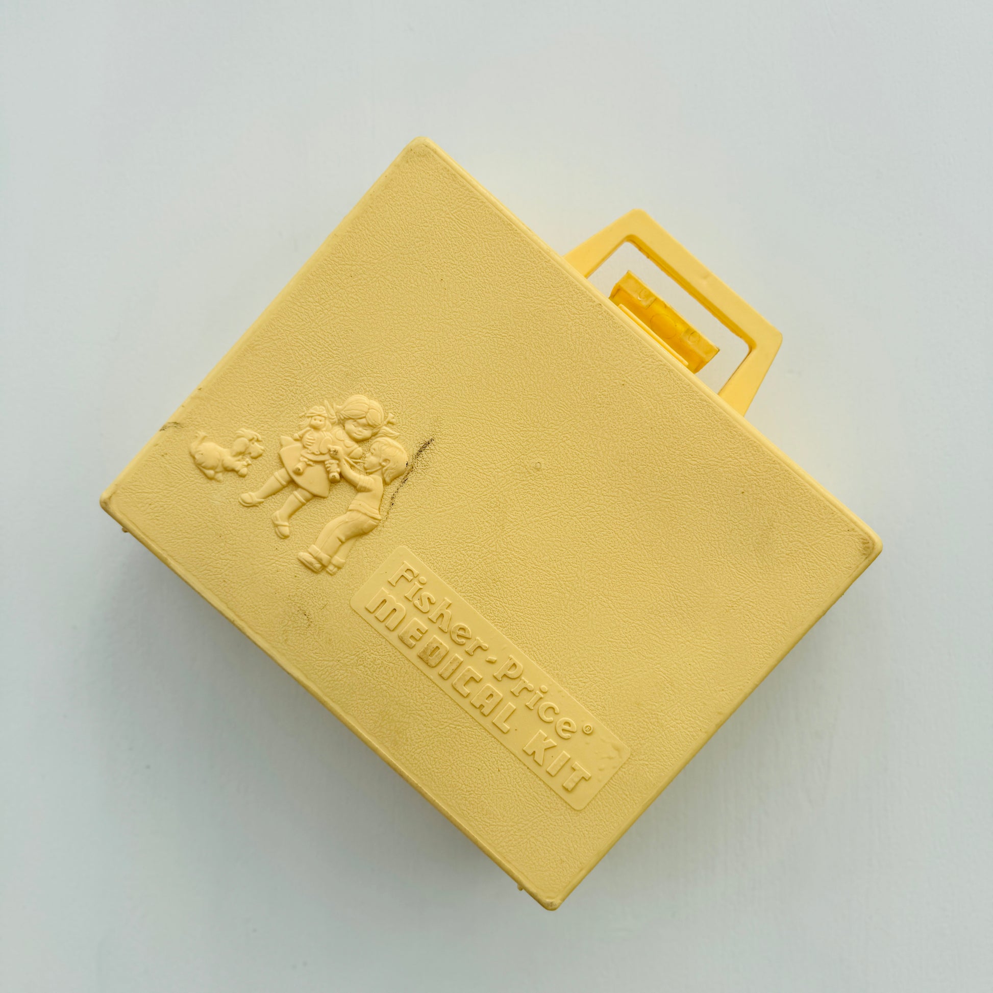 Een klassieker in de categorie duurzaam speelgoed! Deze oldskool doktersset van Fisher Price! Er werd al goed mee gespeeld en de set (vooral de doos) heeft gebruikssporen naar leeftijd.