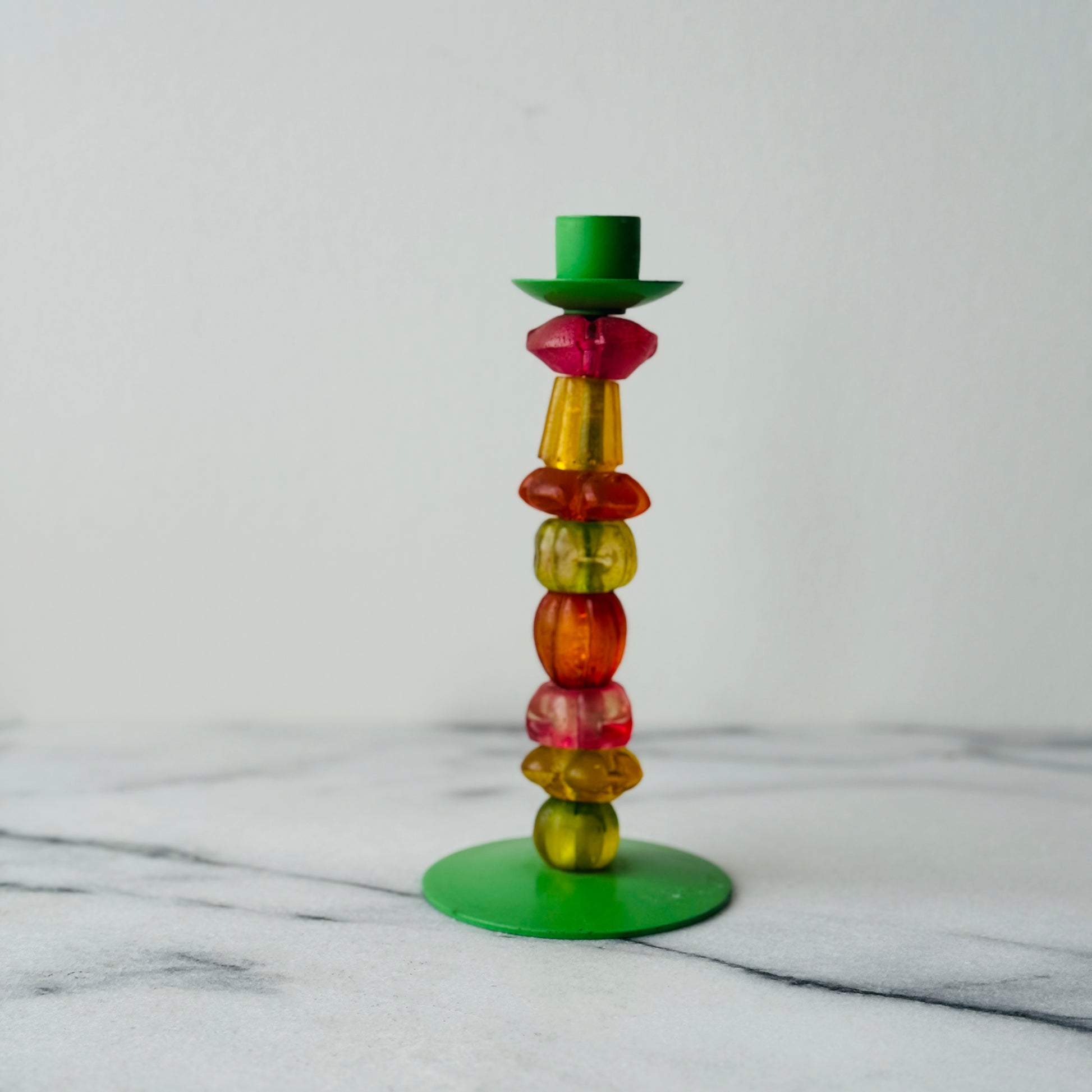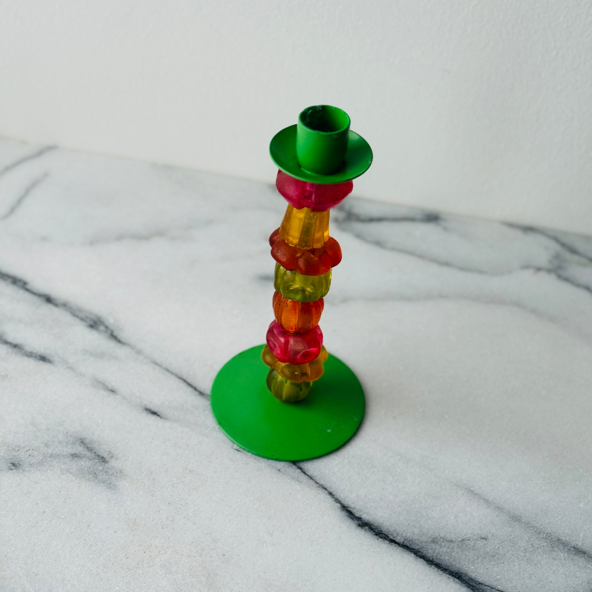 Het lijken net snoepjes… metalen kandelaar met kunststof parels.