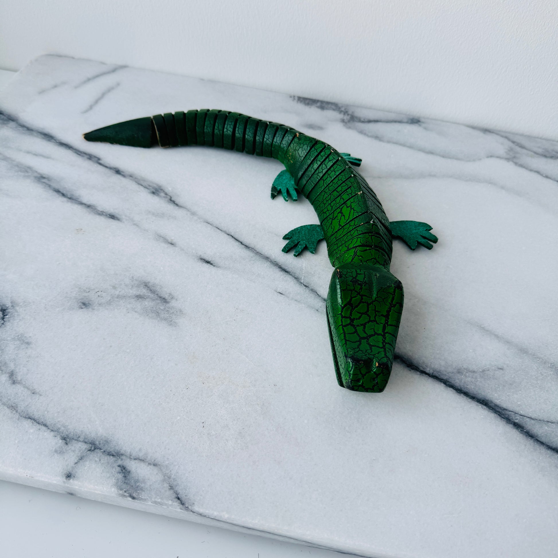 Decoratieve houten krokodil, tegelijk leuk om mee te spelen. Door de slipjes in het lichaam kan je het dier in verschillende posities plaatsen.