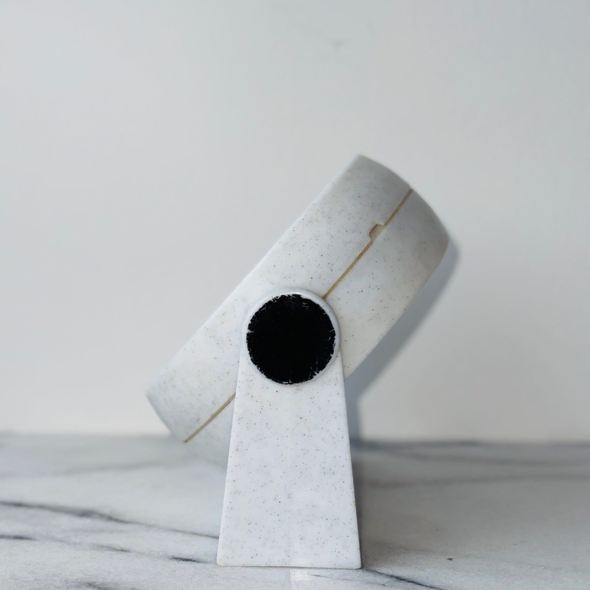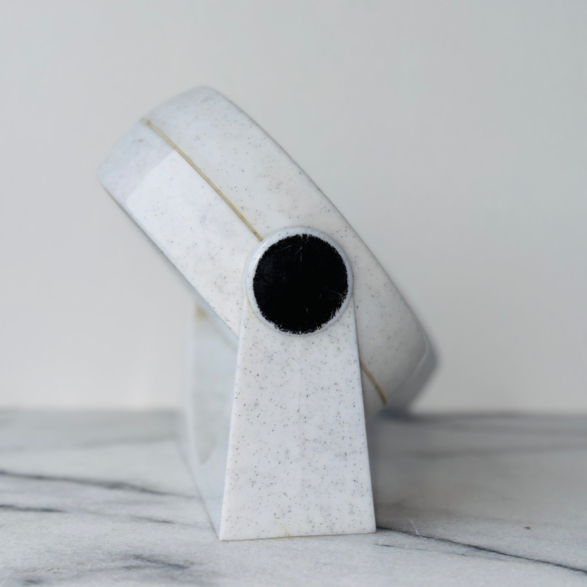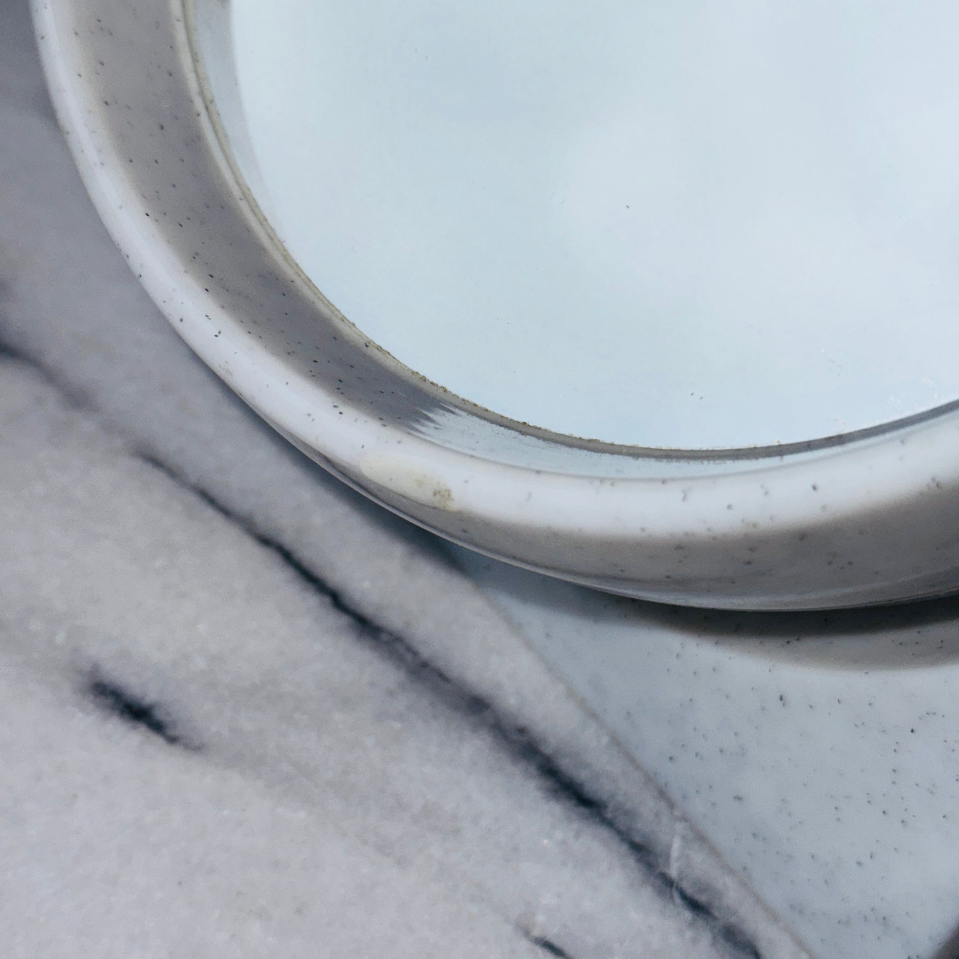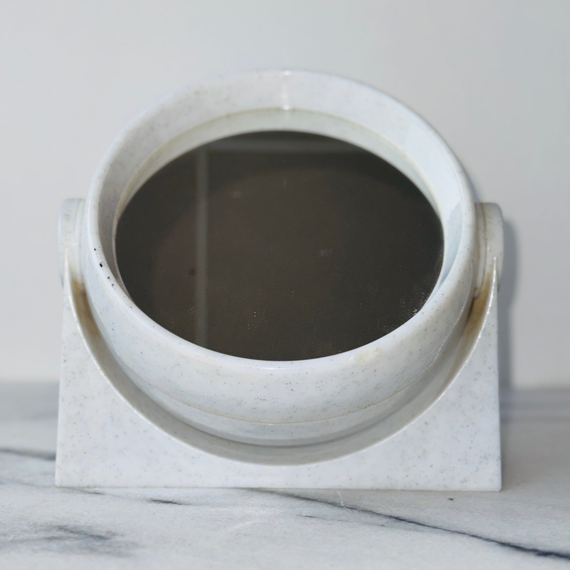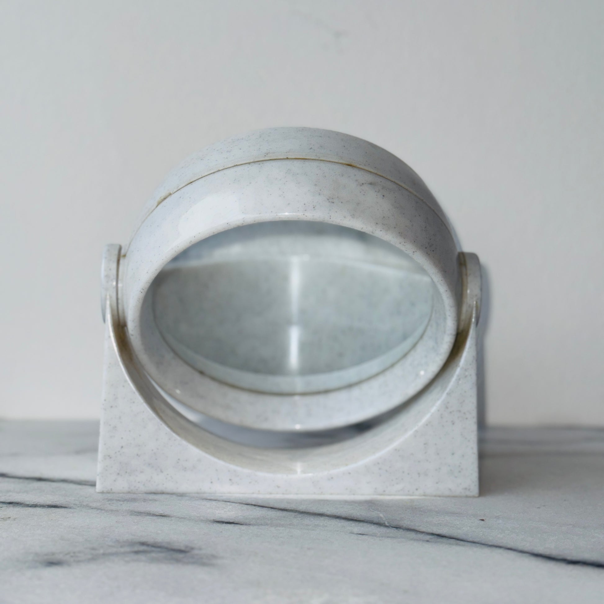 Leuke make-up spiegel in een gespikkeld lichtgrijs kunststof. De spiegel draait om z’n as en is langs 2 zijden bruikbaar. Klein krasje op 1 van de spiegels. De rand heeft lokaal een klein putje (lijkt een klein beetje gesmolten).