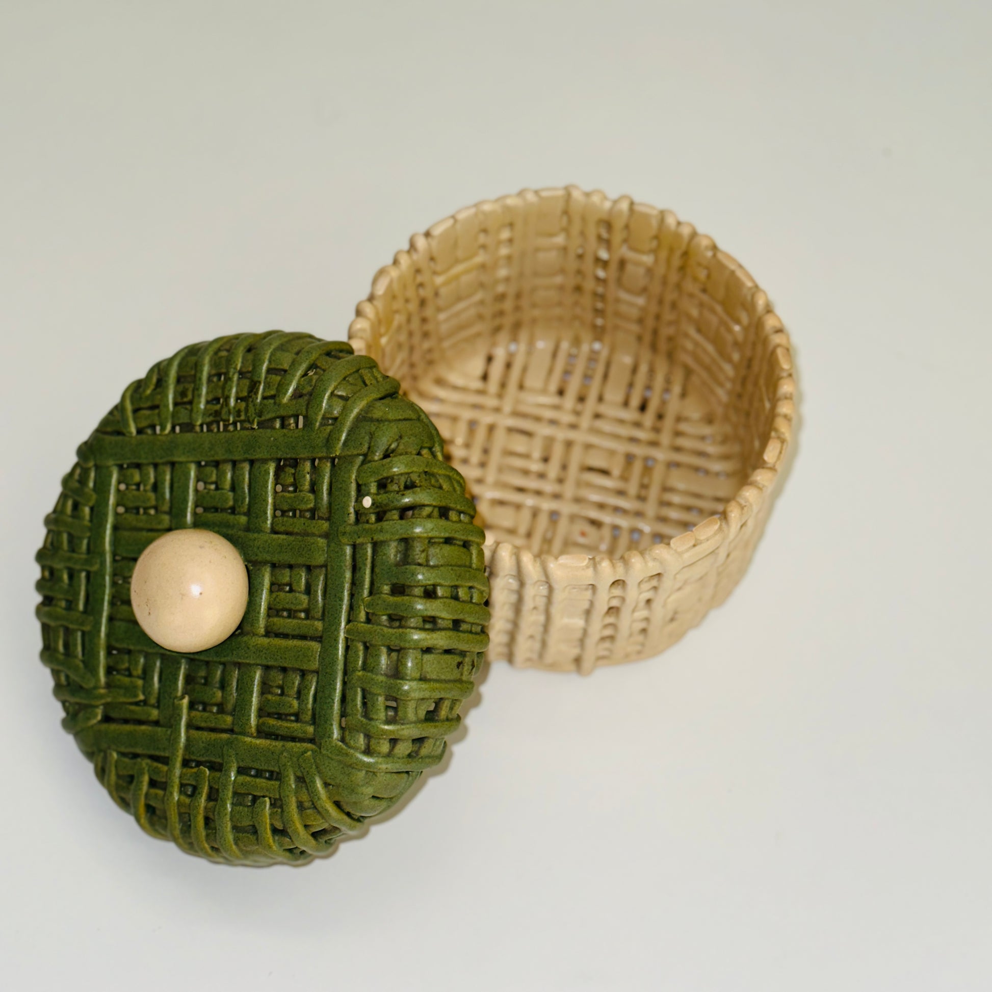Wat een knapperd, deze mand of voorraadpot met deksel uit keramiek. Té leuk om de eitjes of broodjes te presenteren op de Paas- of brunchtafel