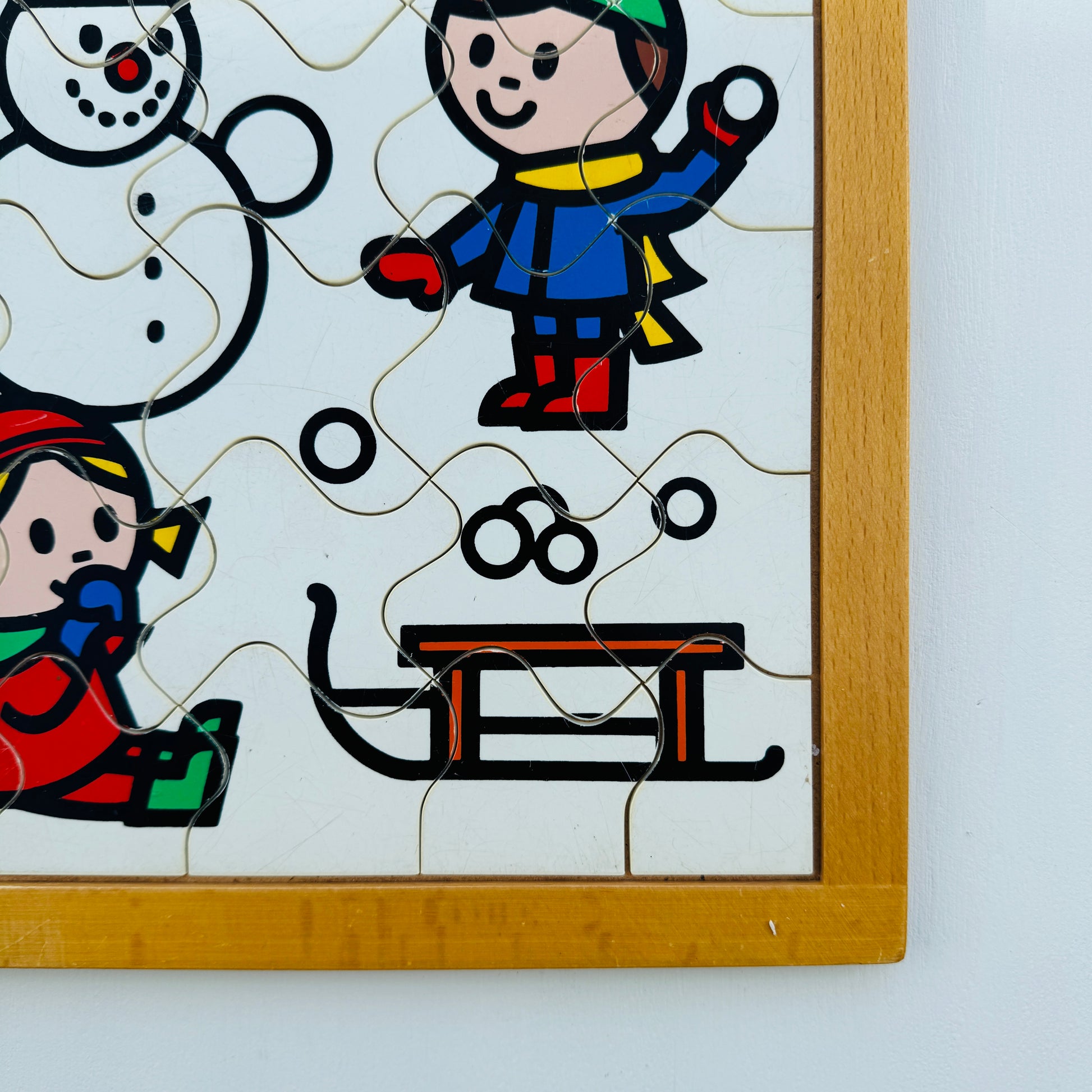 Grote legpuzzel om al spelend te leren over de sneeuw en sneeuwpret. De puzzel is voorzien van kunststofplaatjes in een houten lijst. Puzzel compleet, woop woop!