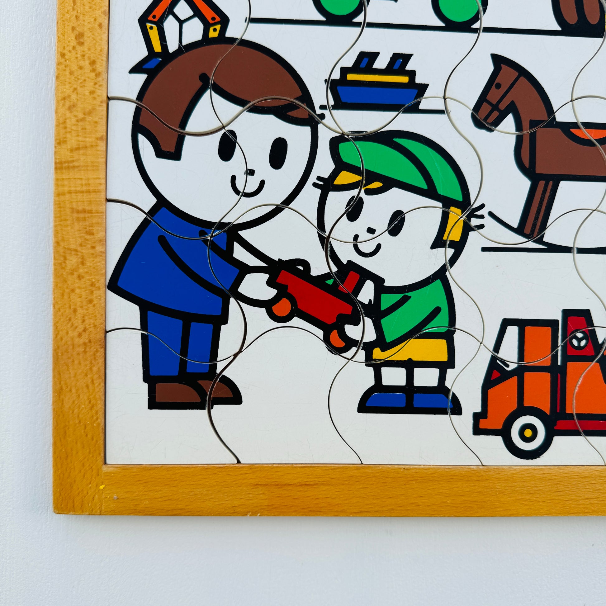 Grote legpuzzel om al spelend te leren rond spelen en speelgoed. De puzzel is voorzien van kunststofplaatjes in een houten lijst. Puzzel compleet, woop woop!