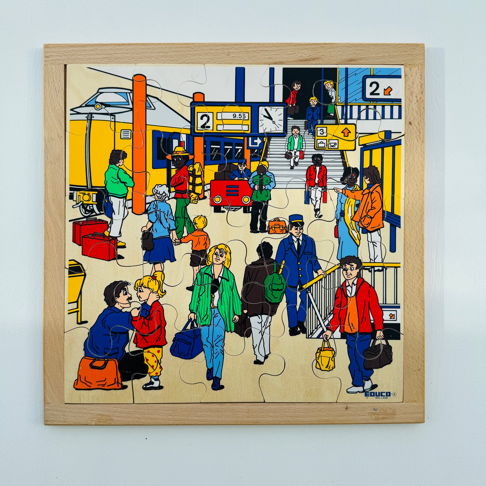 Grote houten legpuzzel met tafereel van een treinstation. De puzzel is voorzien in een houten lijst. Puzzel compleet, woop woop!