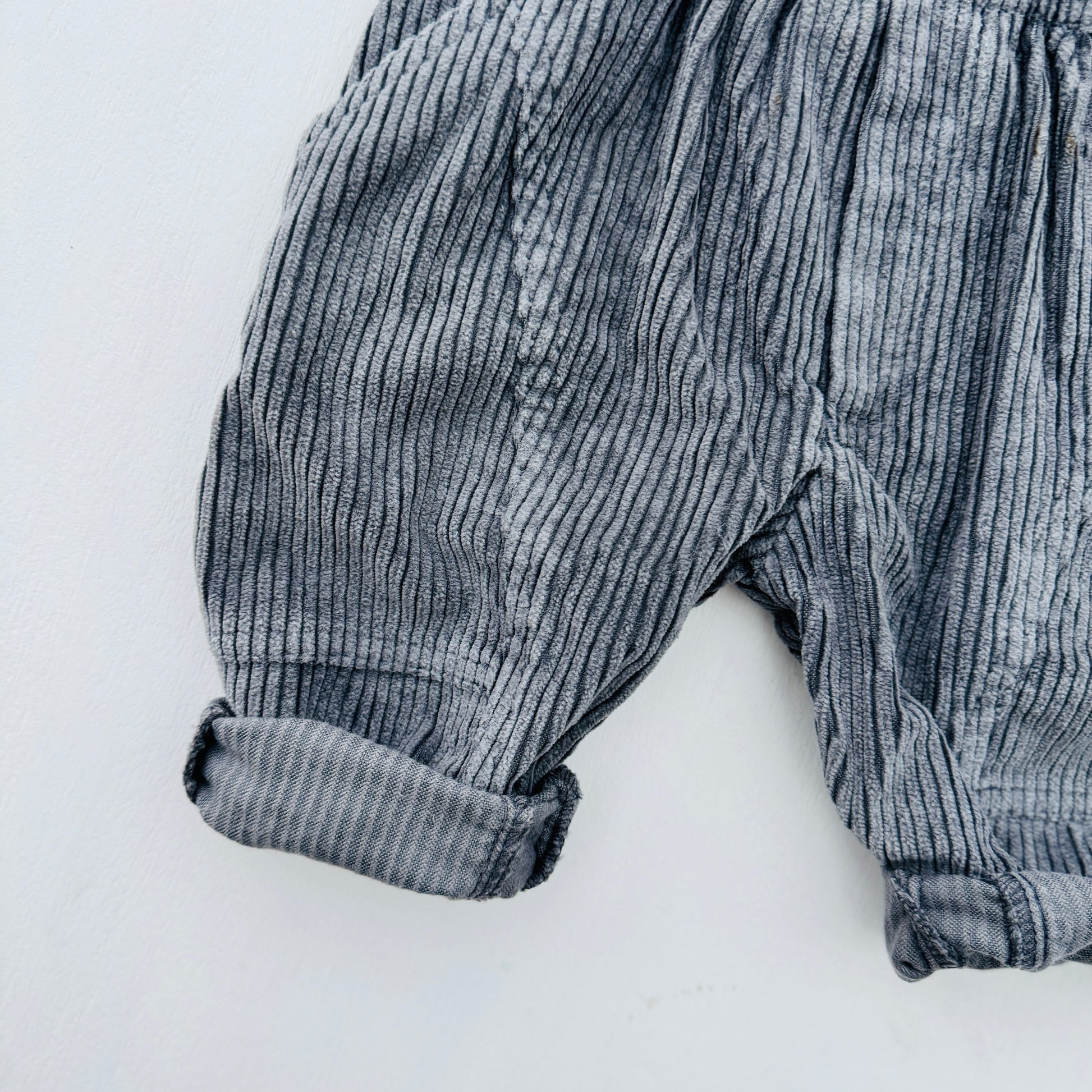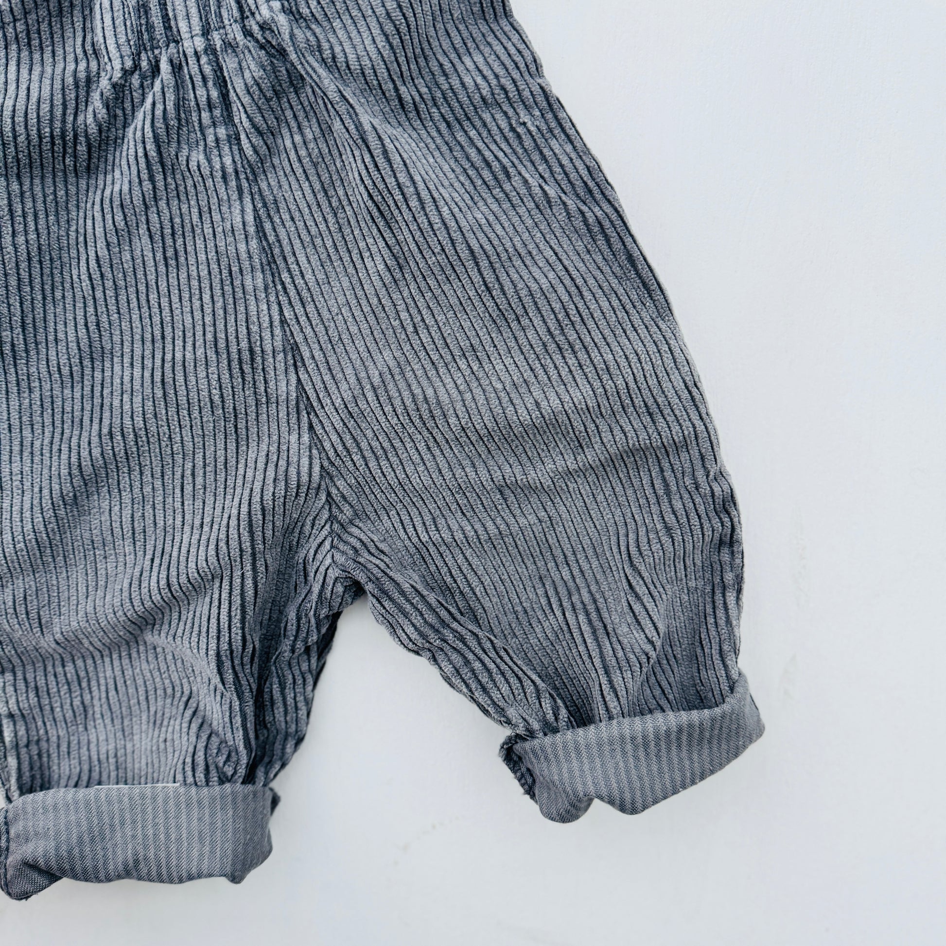 De pijpen zijn onderaan niet omgestikt, vandaar opgerold.