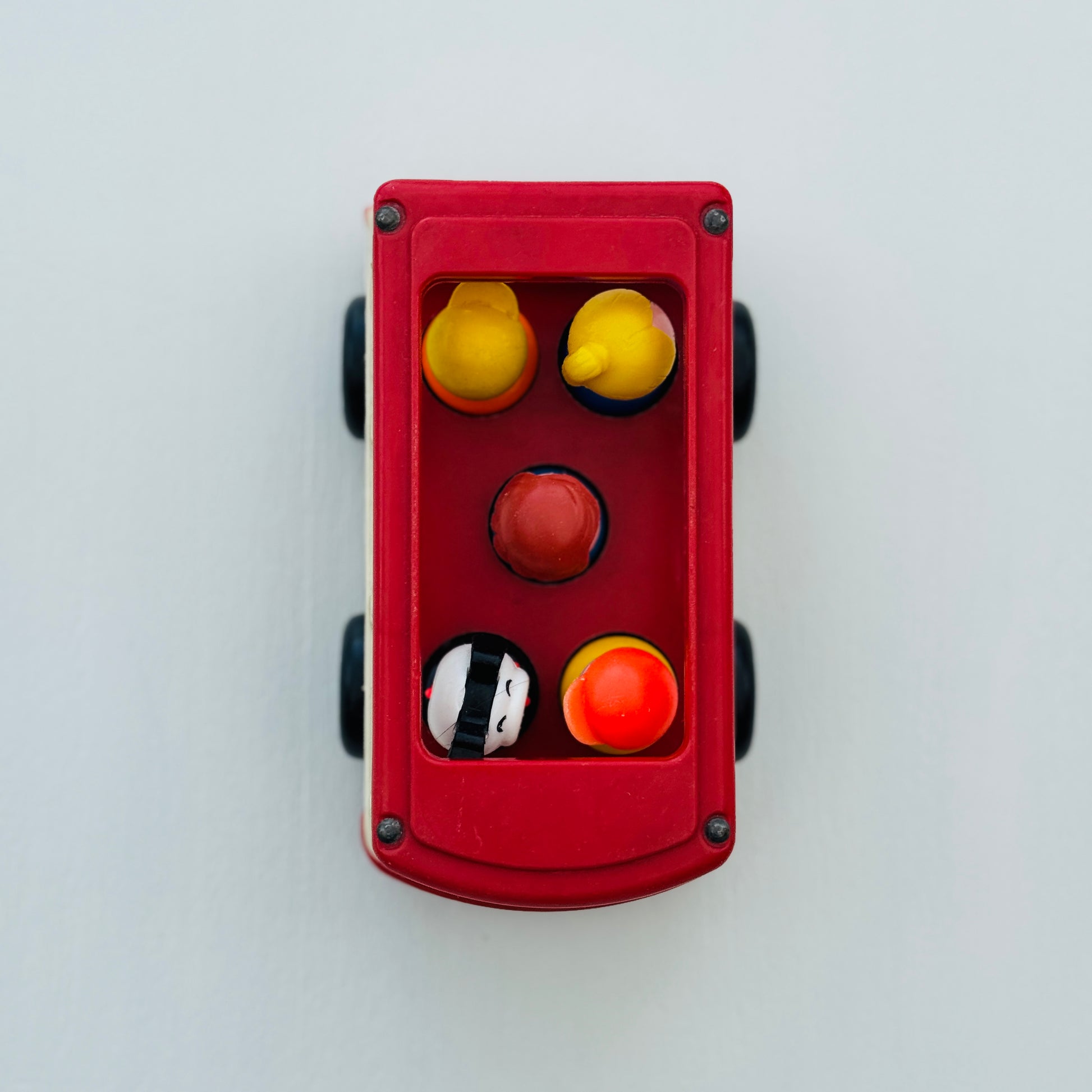 Vroem vroemmm! Daar komt de schoolbus! Wanneer de bus rijdt bewegen de kindjes in de bus op en neer. De bumper had al wat accidentjes te verduren maar verder verkeert ze in prima staat! De set komt met alle toebehoren zoals zichtbaar op de foto's.