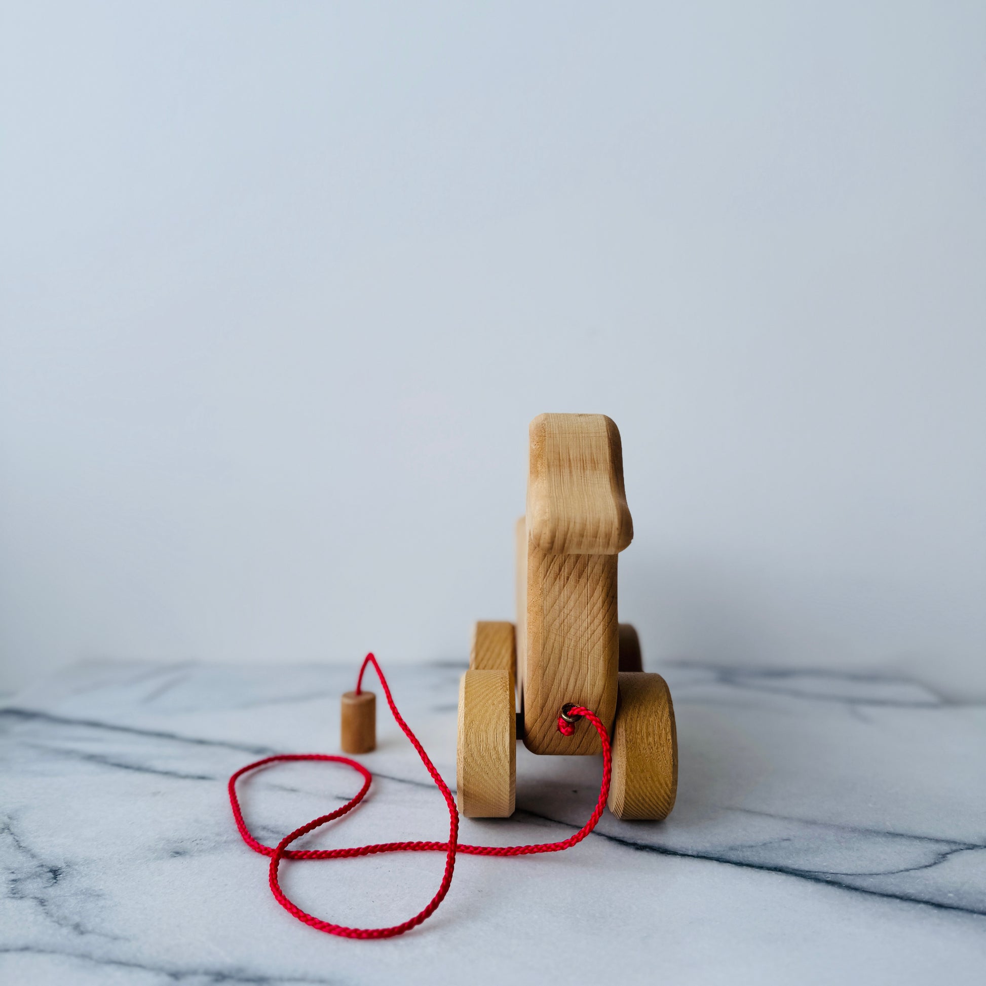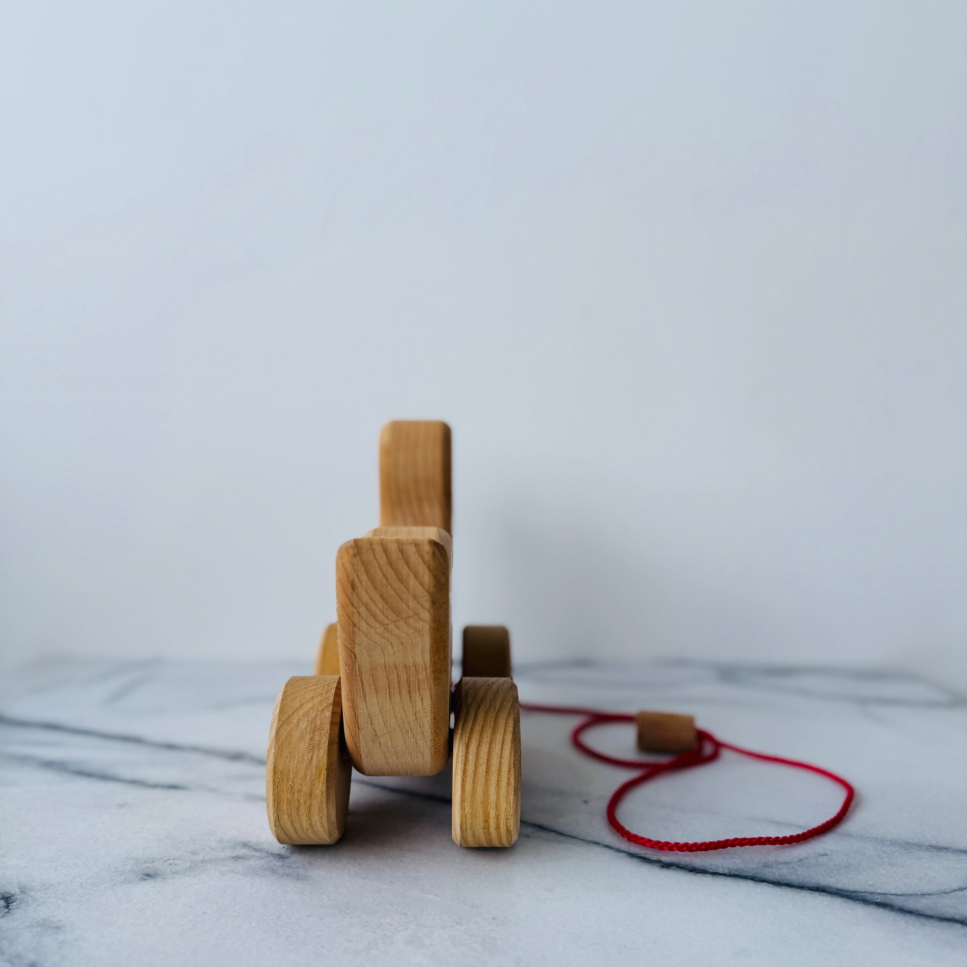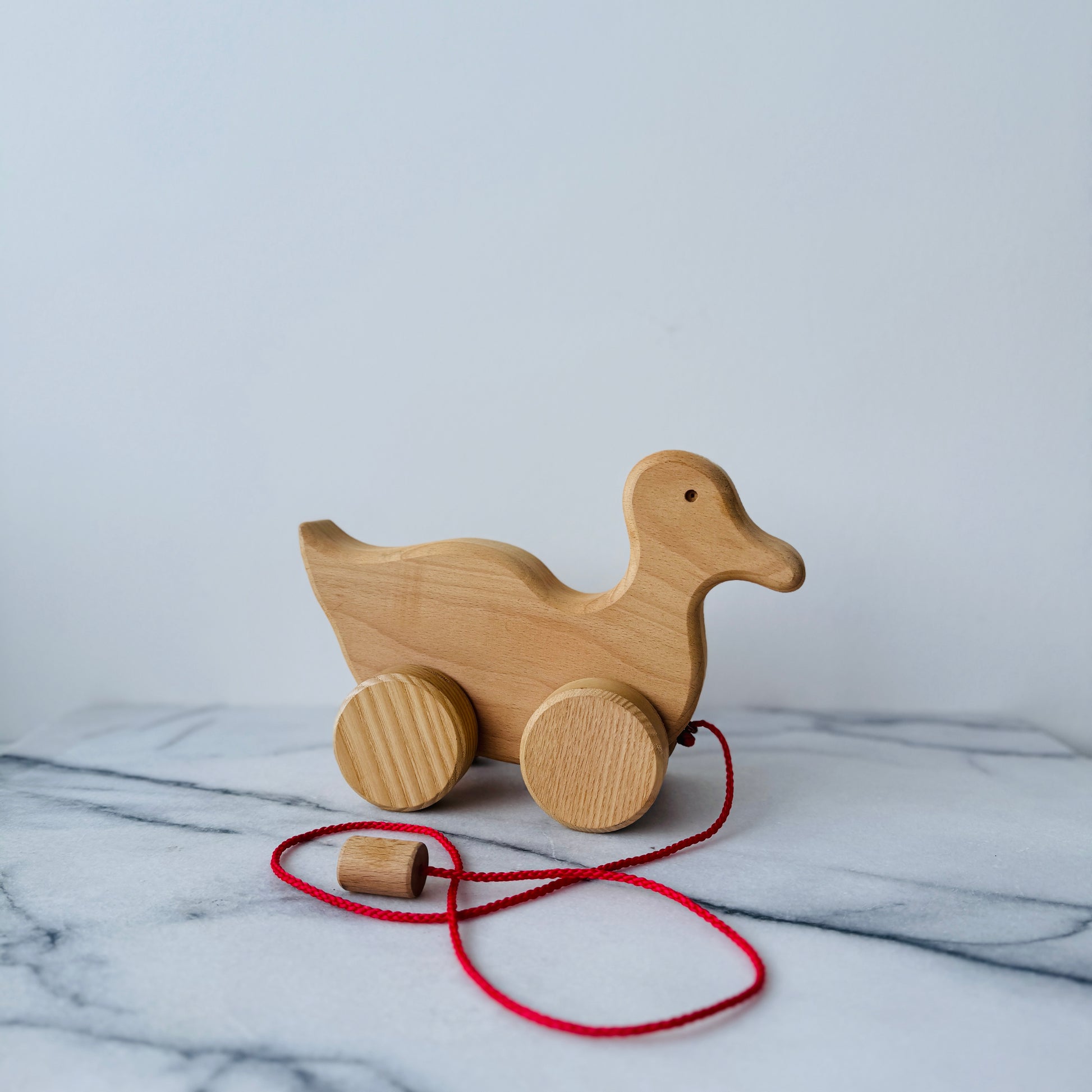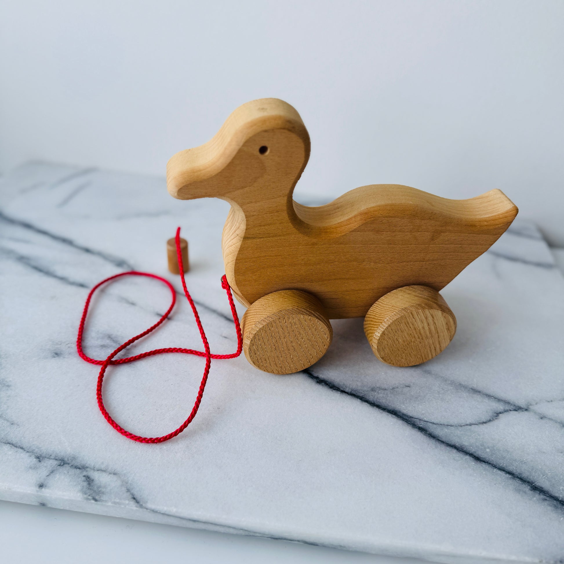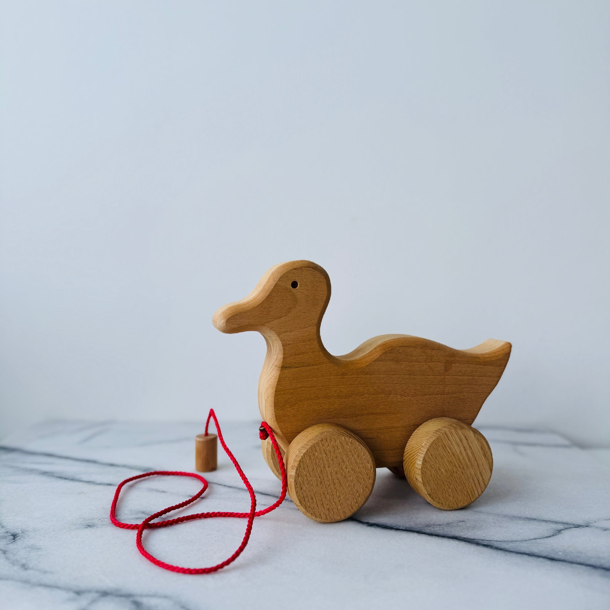 Leuke trekeend in massief hout. De eend verkeert in super staat en vertoont amper gebruikssporen.