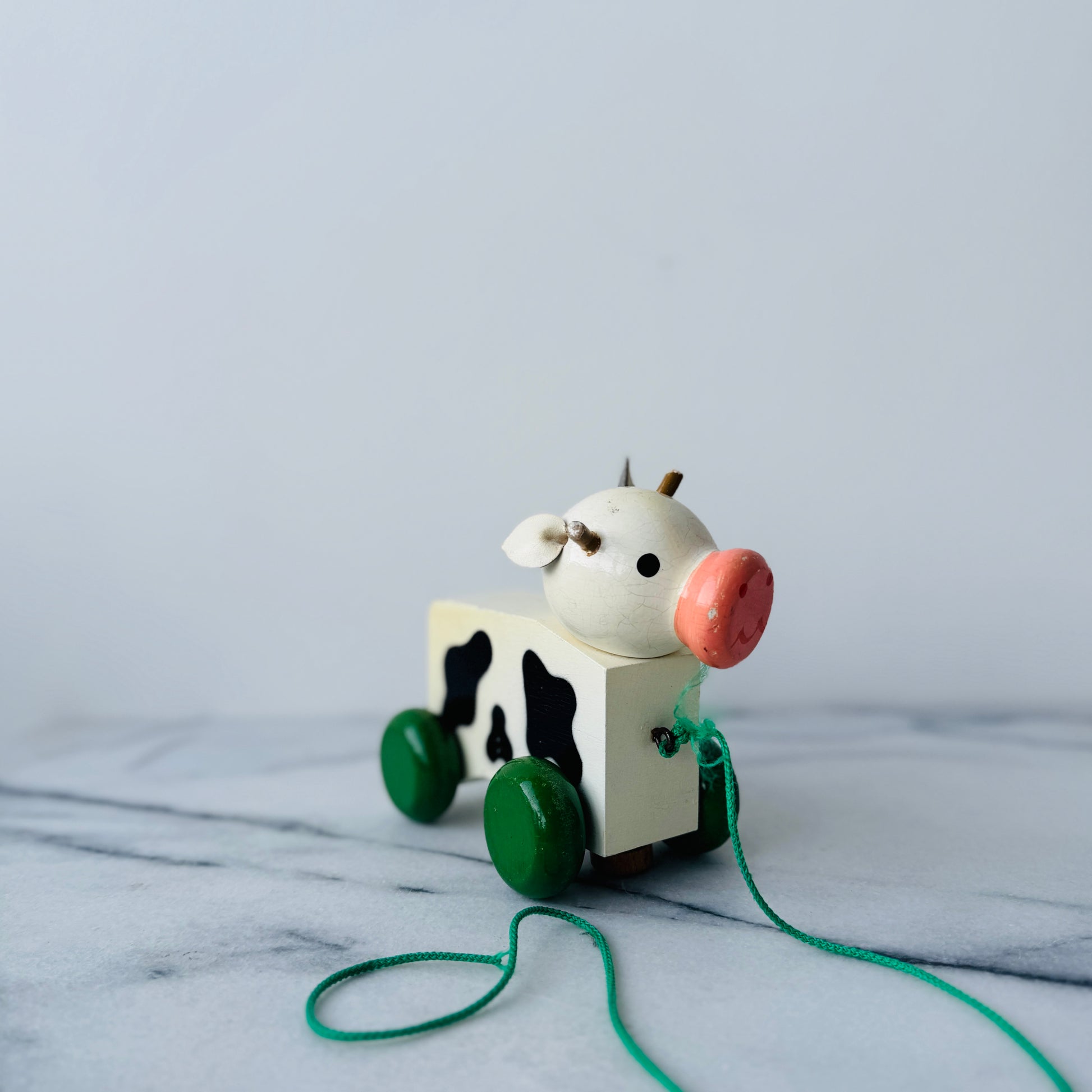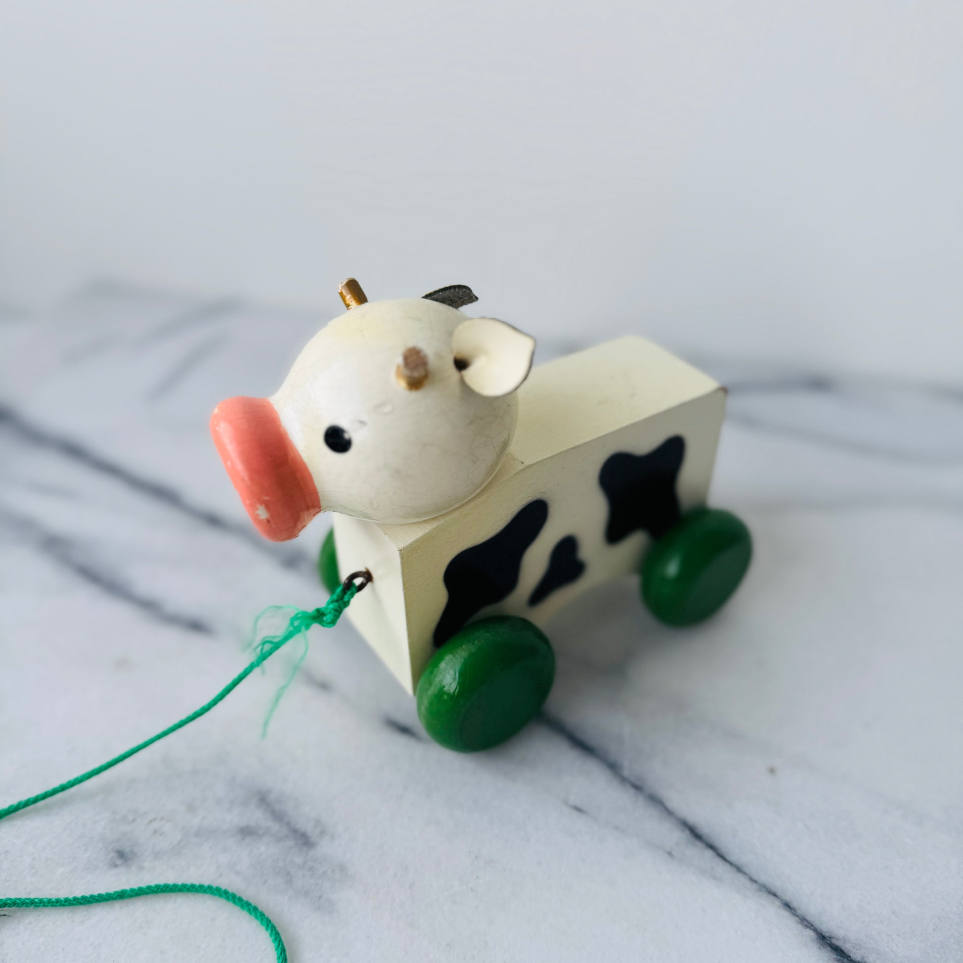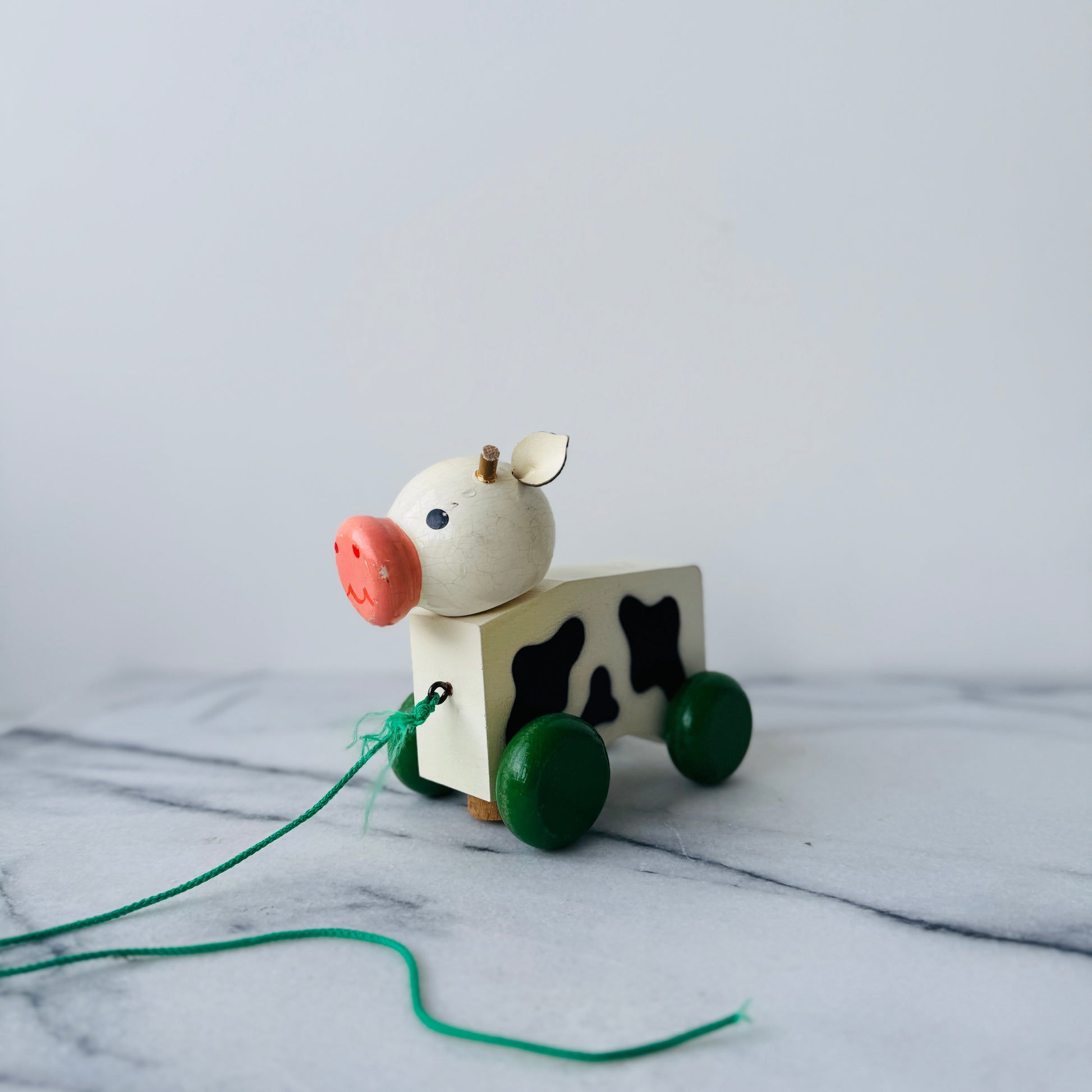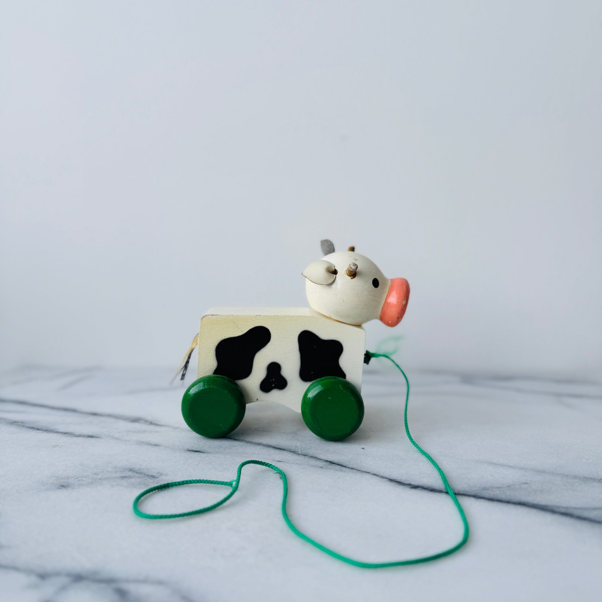 Schattig trekspeeltje in de vorm van een koe. Het speeltje is gemaakt van hout en werd handbeschilderd. Mooie staat!