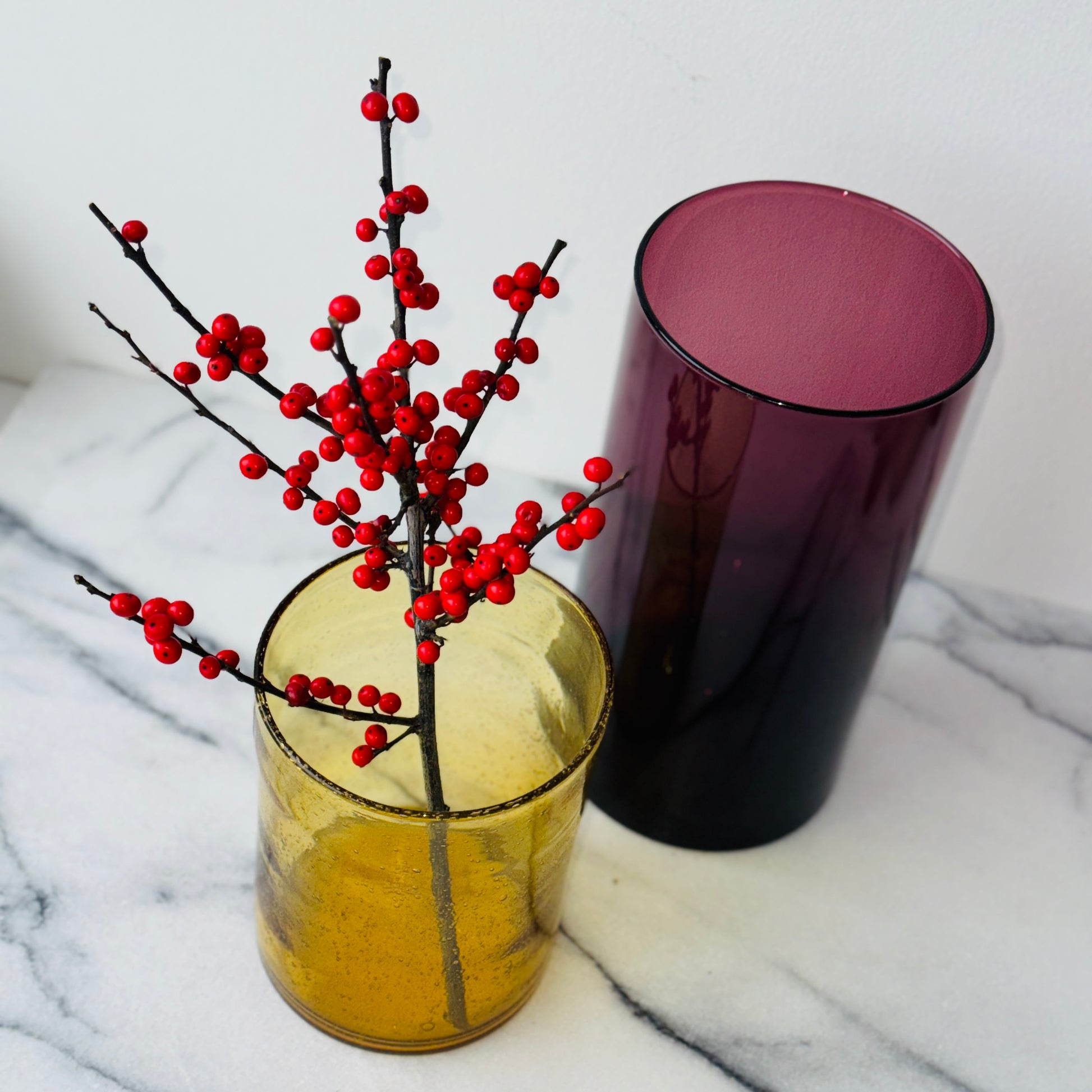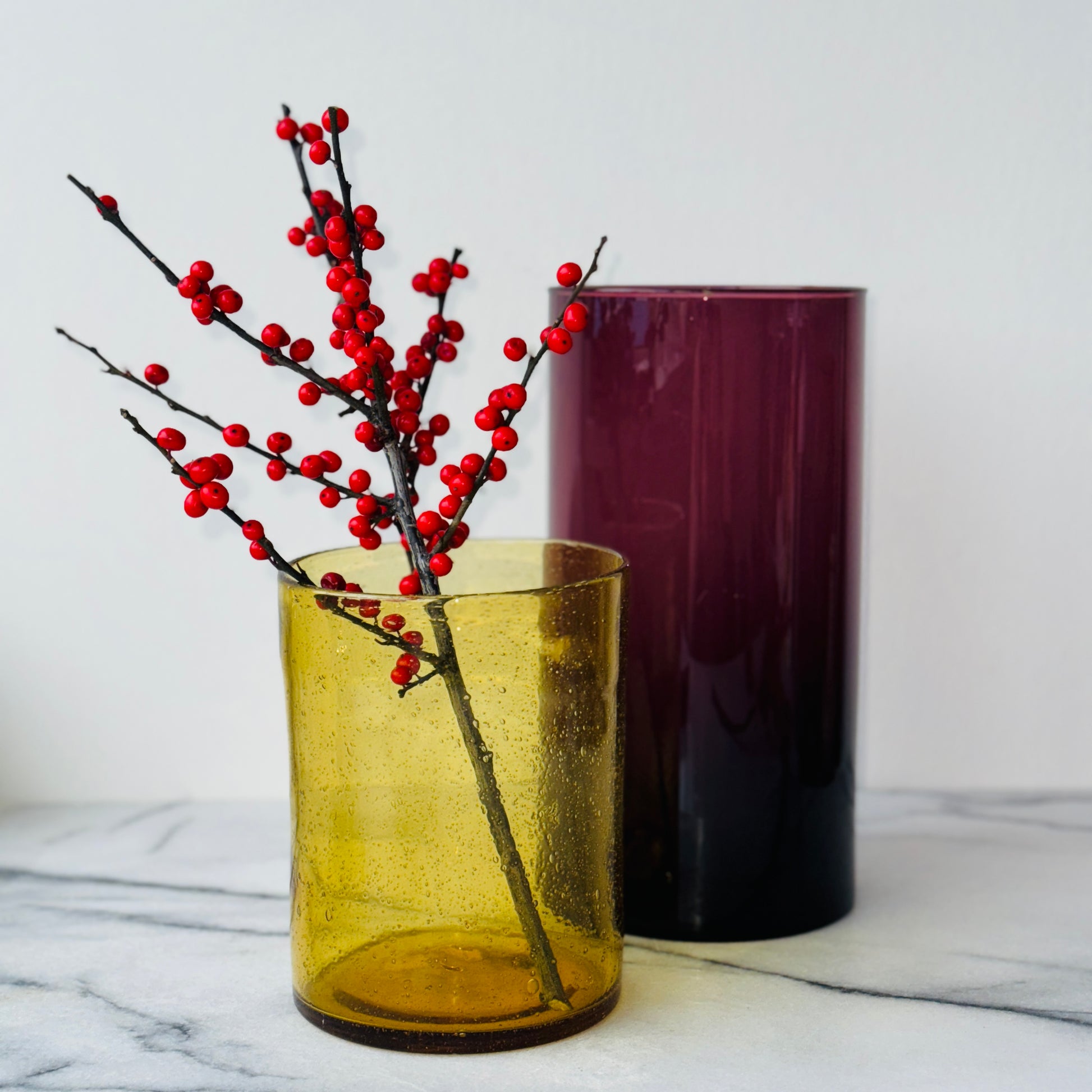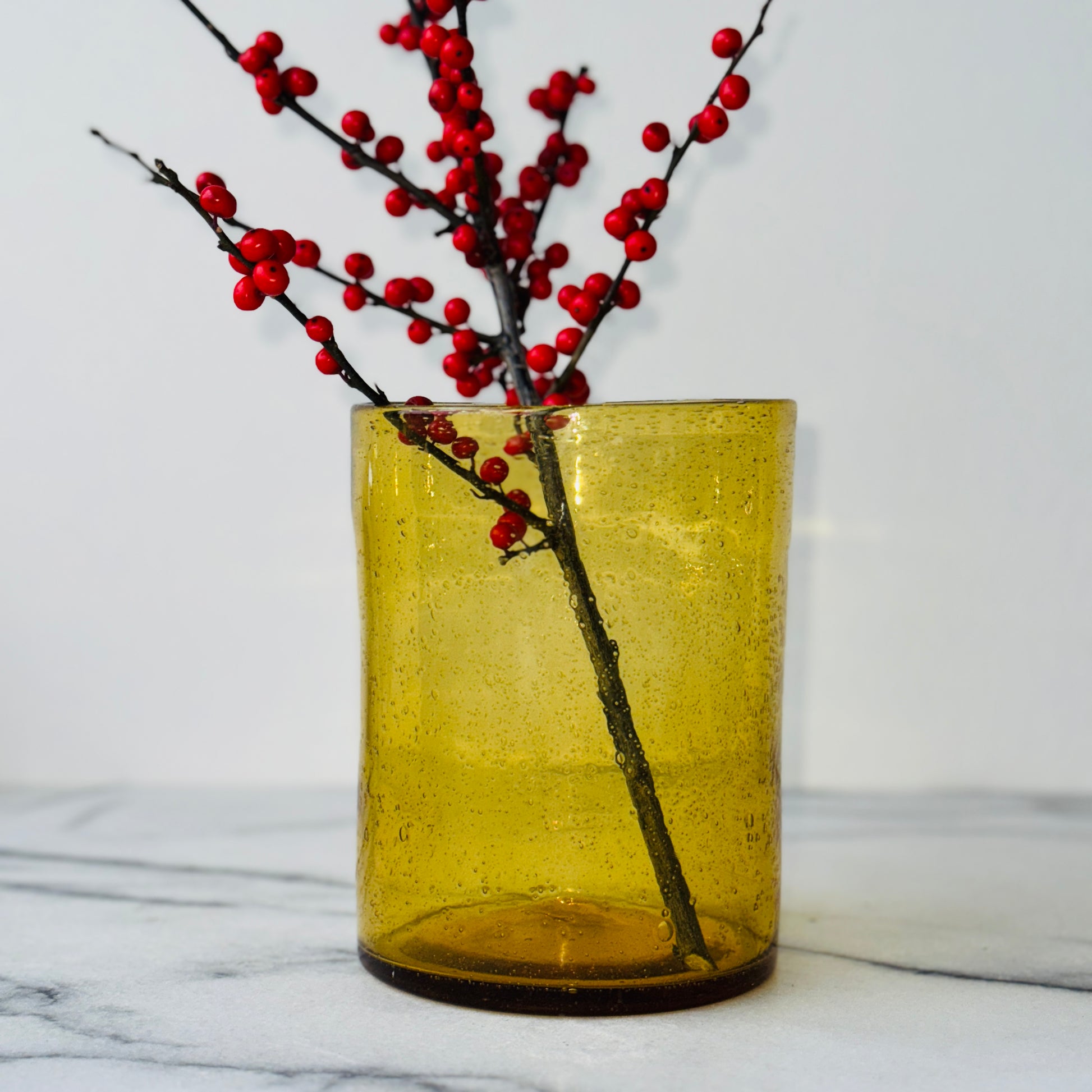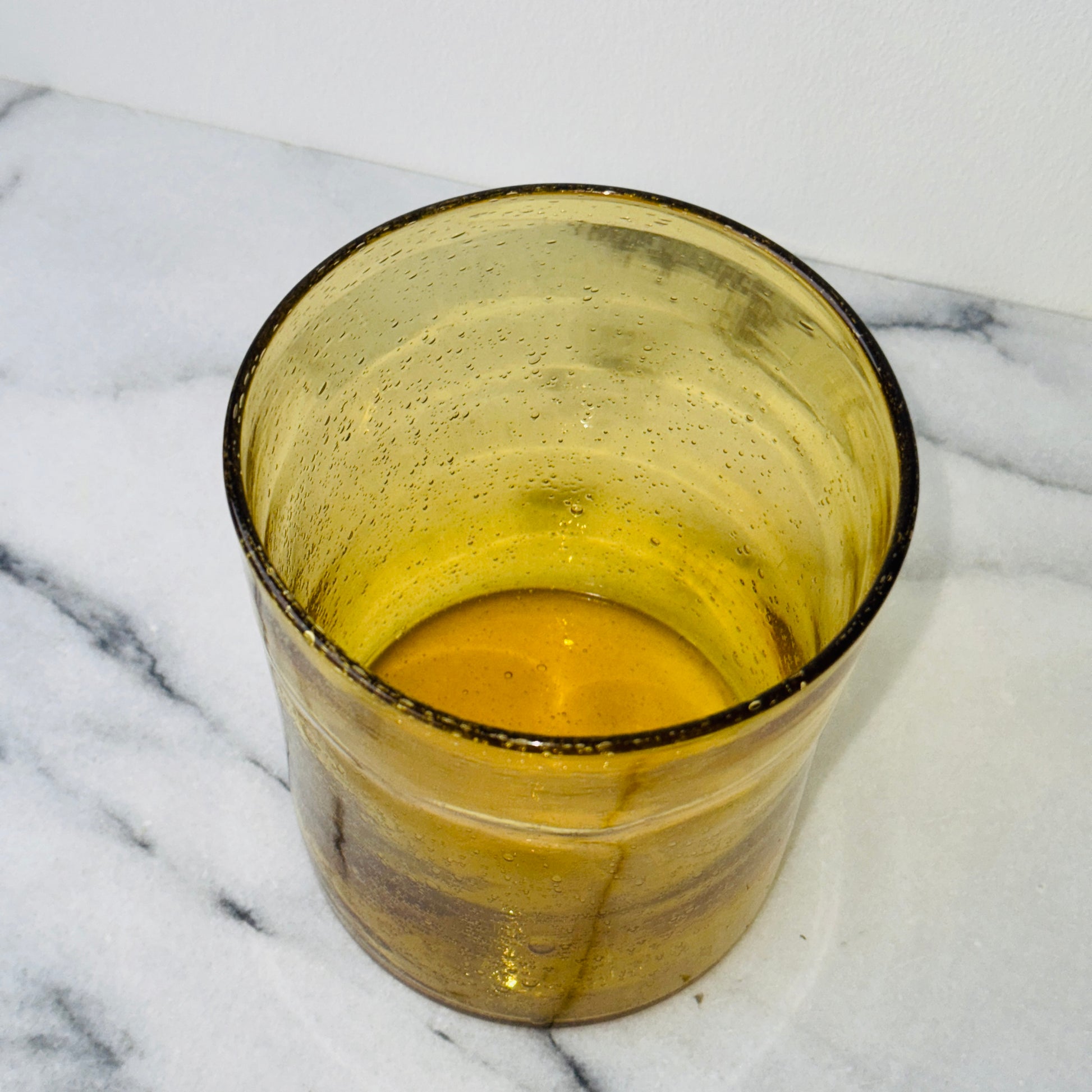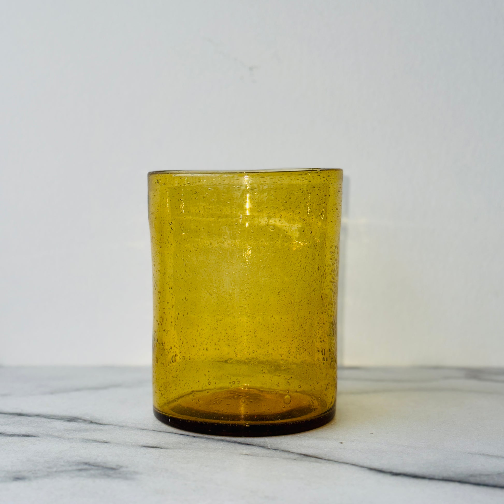 Okergele vaas in geblazen glas. Sprekend zijn de bubbels en bellen die zichtbaar zijn in het oppervlak. Geweldig mooi met een klein boeketje of met een grote kaars erin.