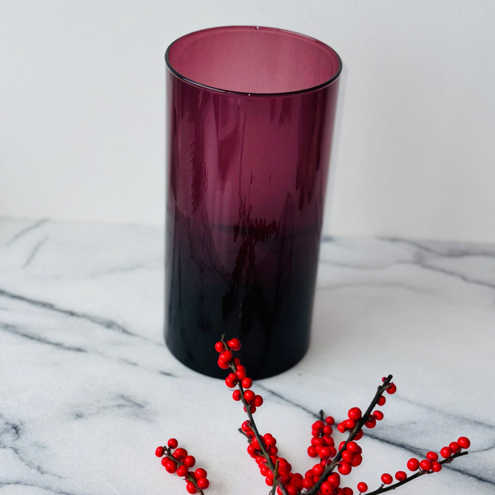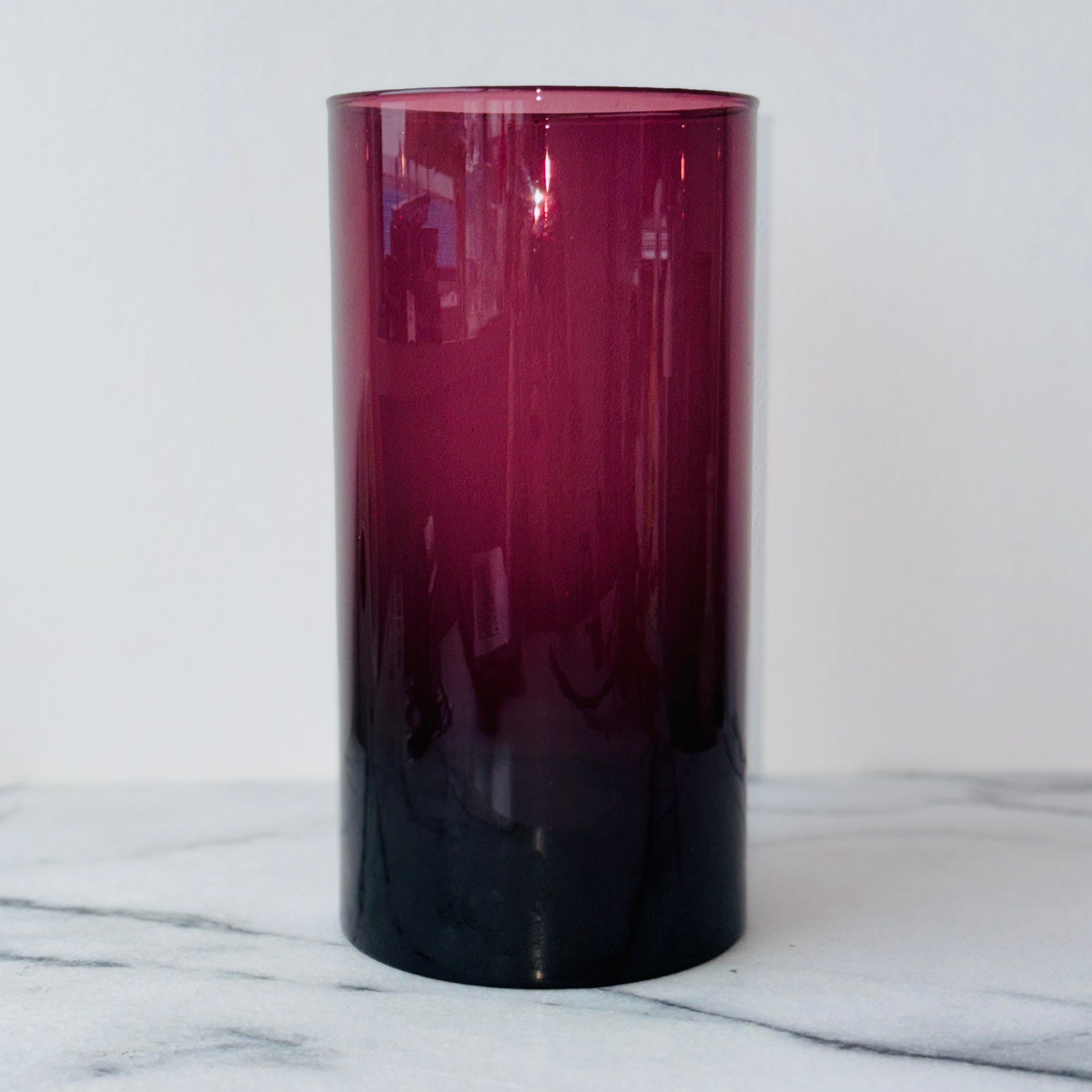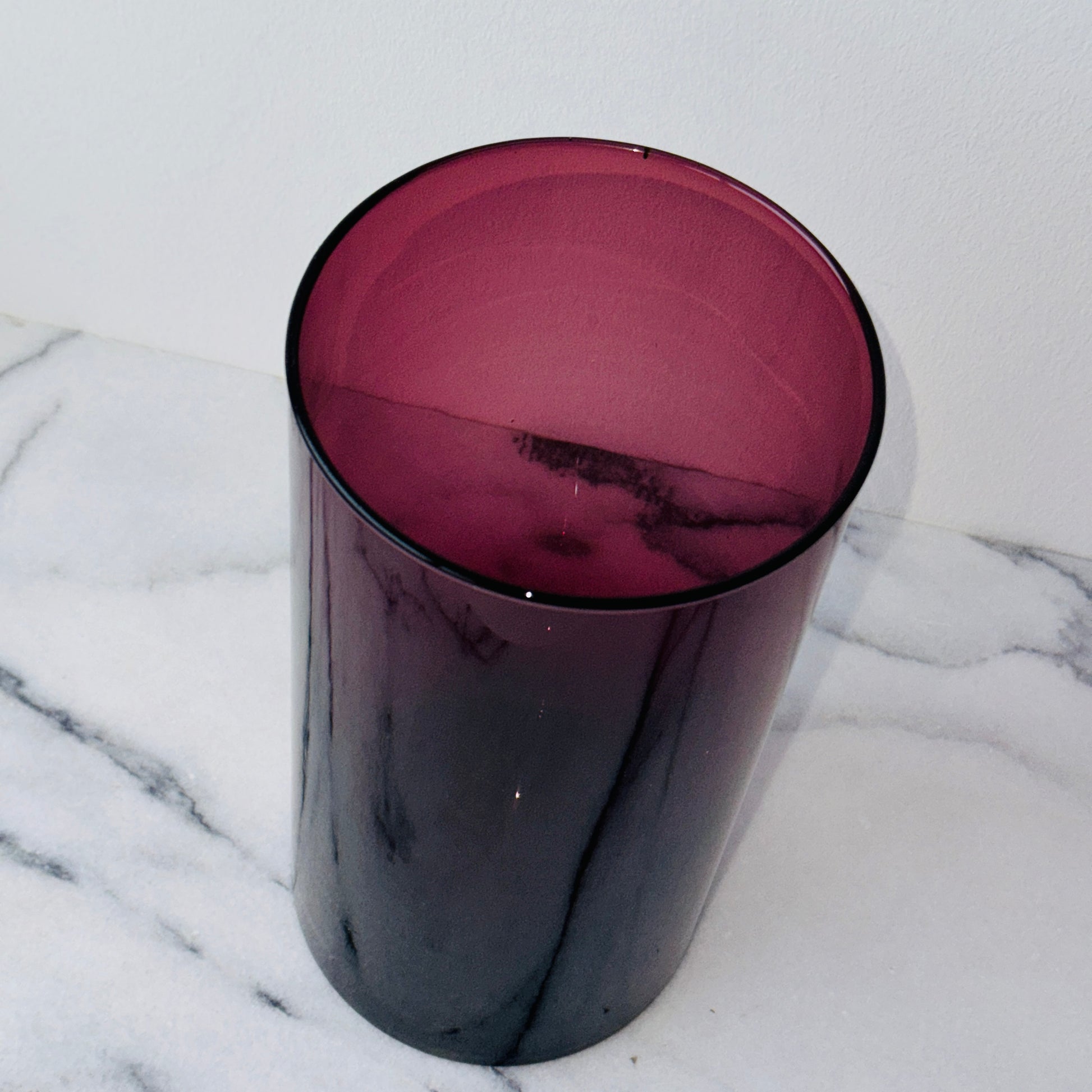 Diep paarse cilindervaas in glas. Prachtig stuk om de feesttafel te stylen met een boeketje, losse takken of een grote kaars