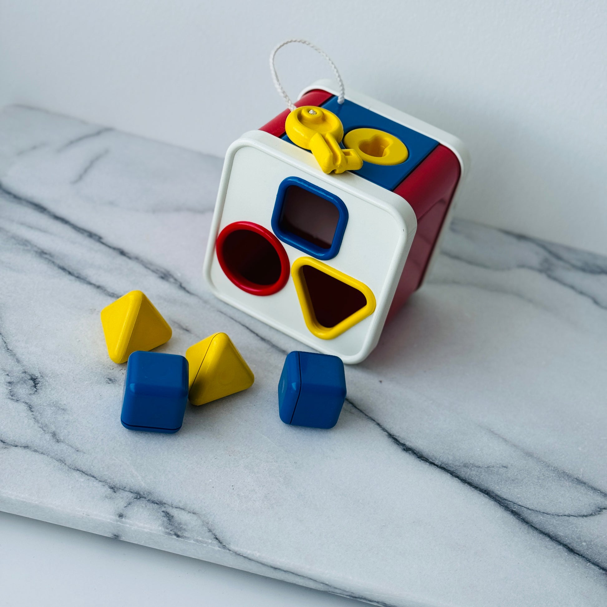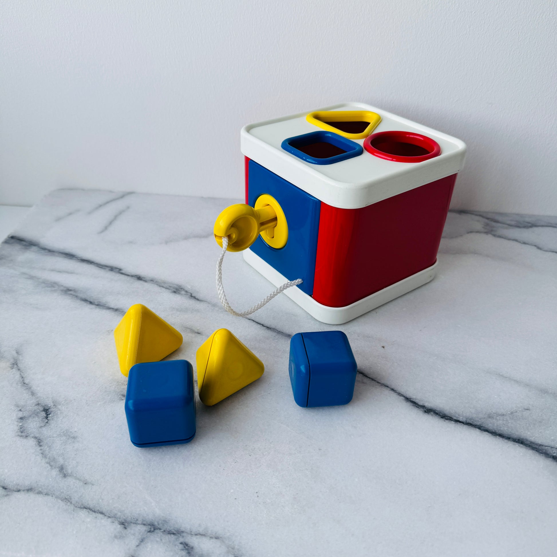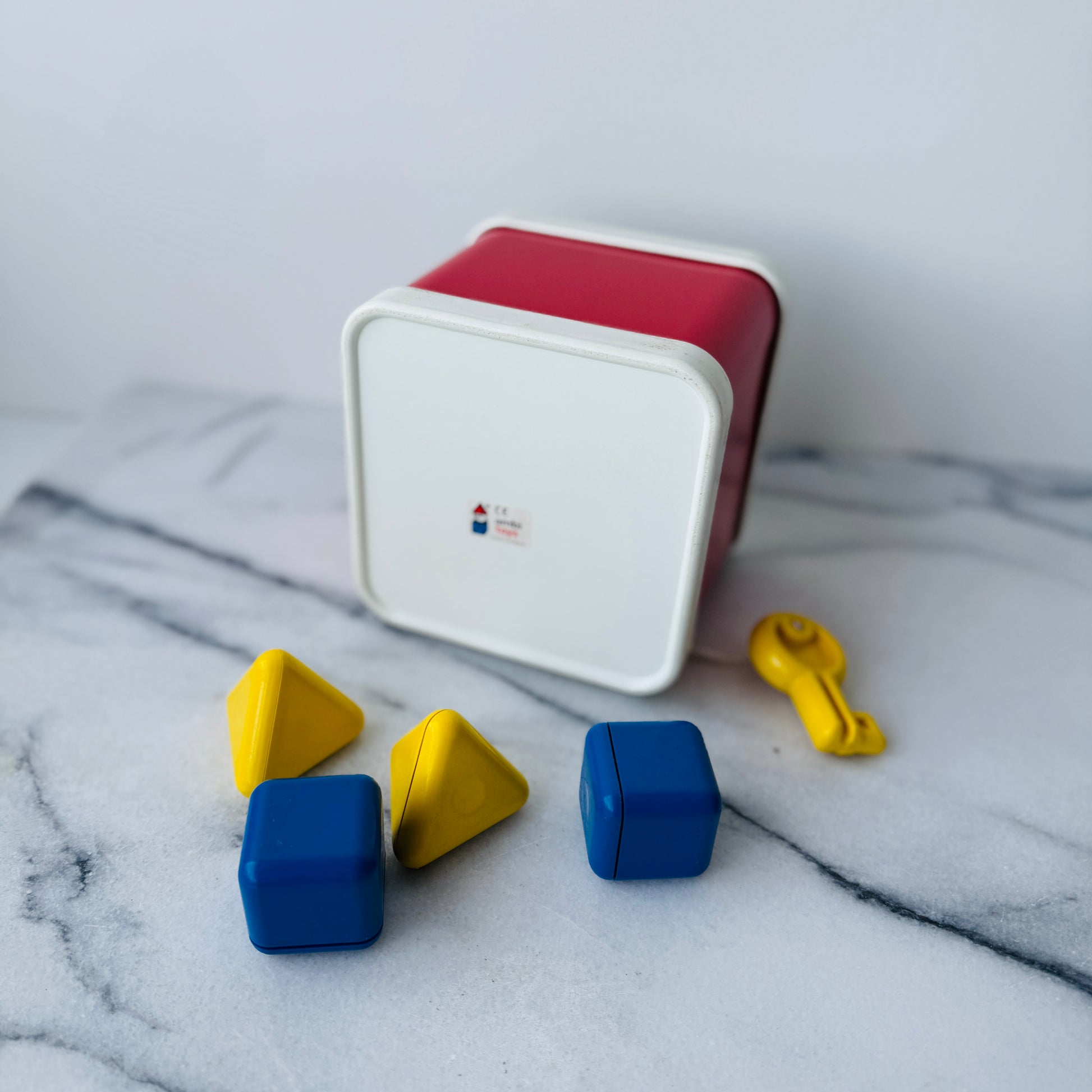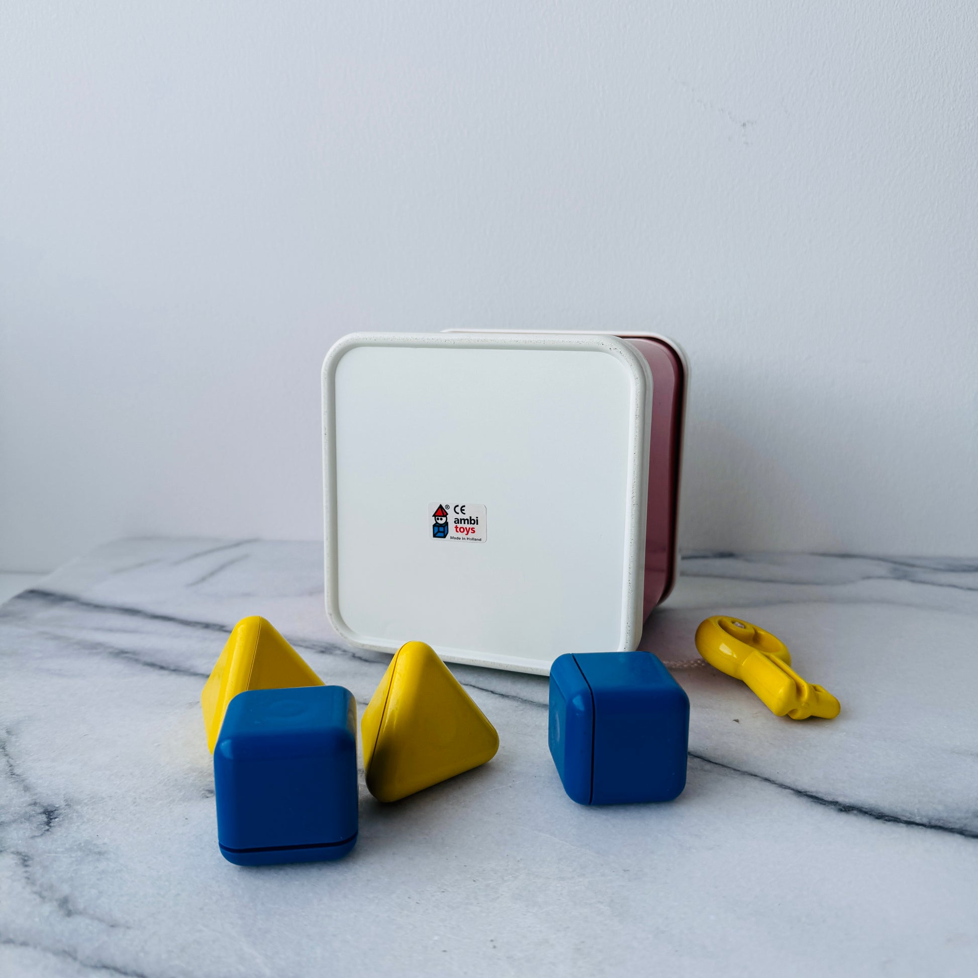 Geweldige vormenstoof van het nostalgische merkje Ambi Toys. Voorzien van 4 gekleurde vormen. De rode bollen ontbreken helaas. Het bakje kan worden geopend door de gele sleutel. Speeltje in mooie staat maar helaas niet helemaal compleet